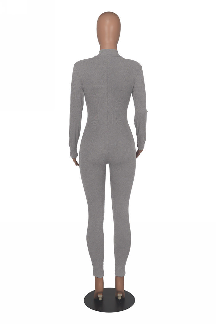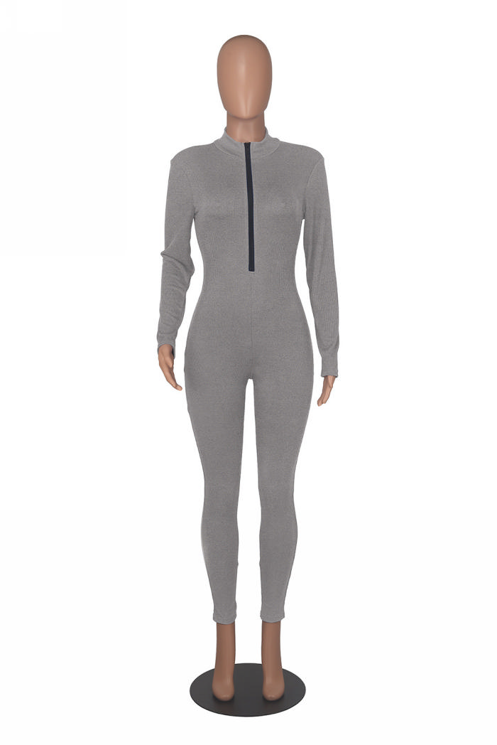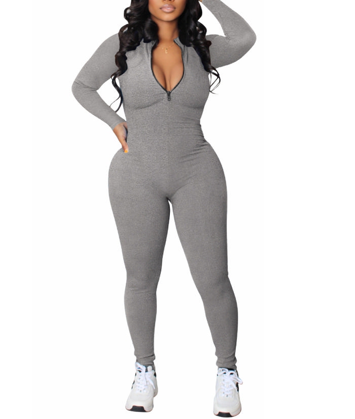 (Real Image)2022 Styles Women Fashion Summer TikTok&Instagram Styles Long Sleeve Front Zipper Solid Color JumpsuitSKU: #OEM5760-3