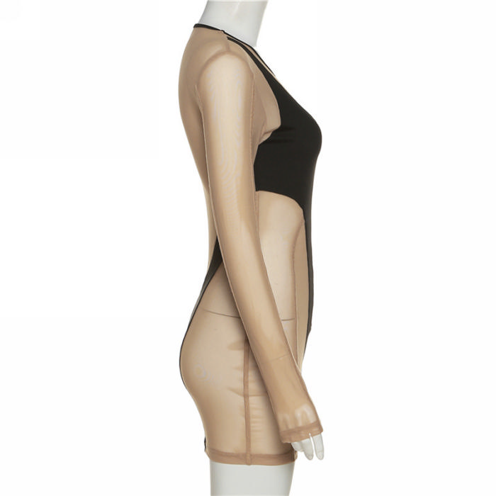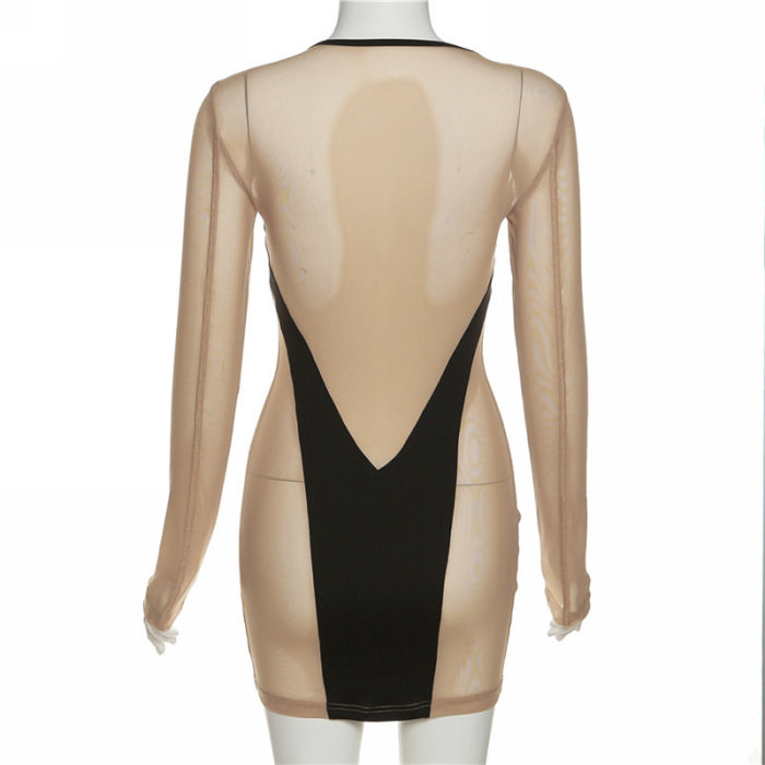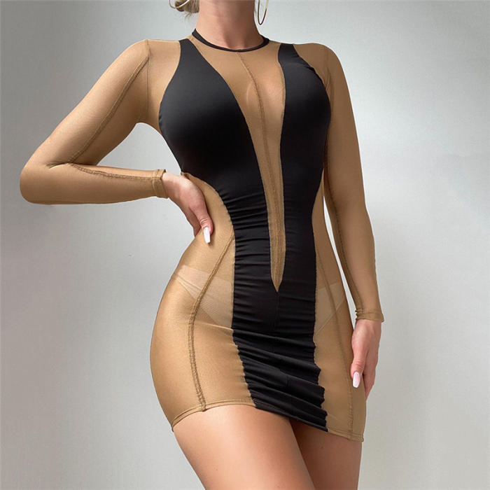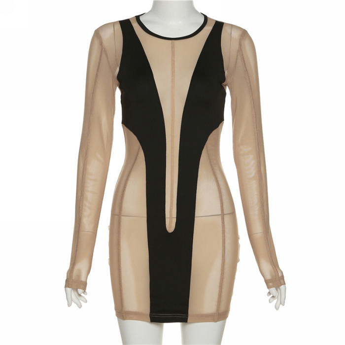(Real Image)2022 Styles Women Fashion Summer TikTok&Instagram Styles Mesh Khaki&Black Long Sleeve Mini DressSKU: #CF48796-1