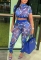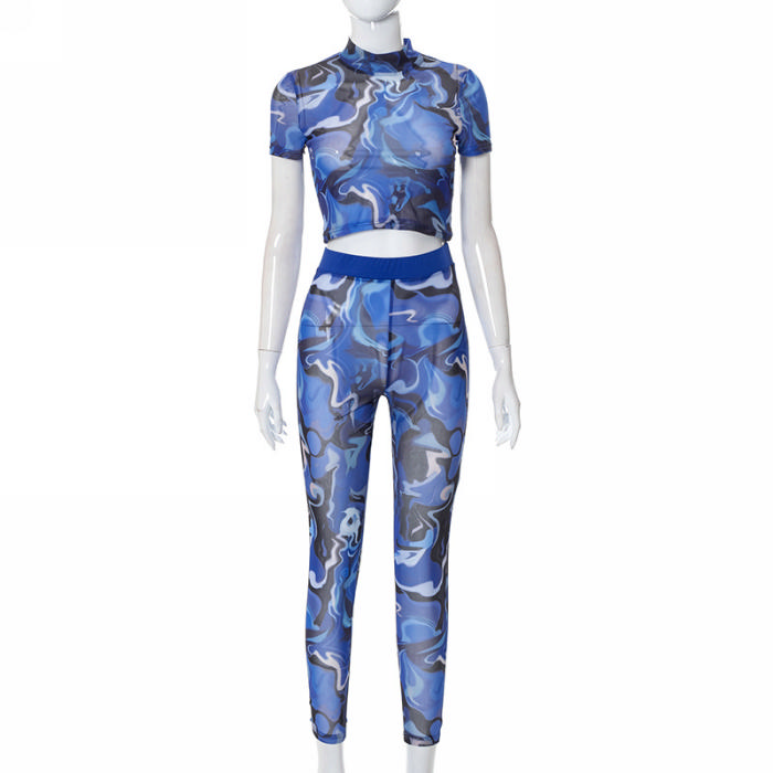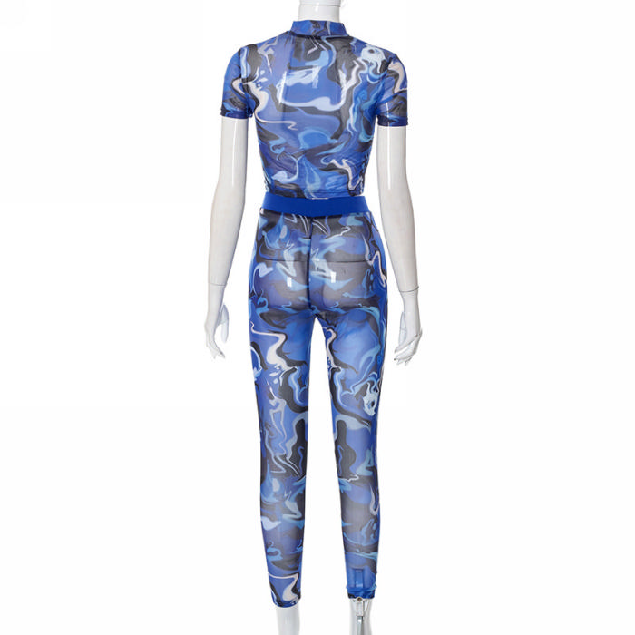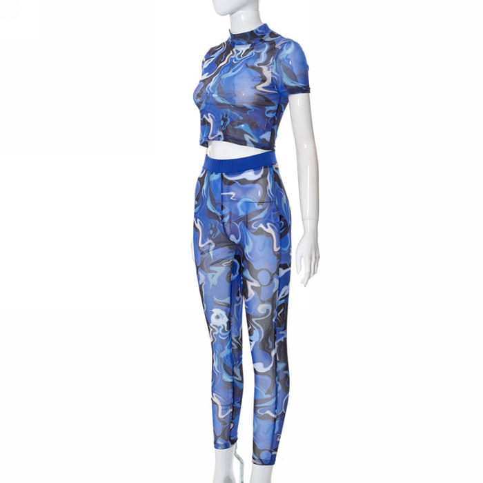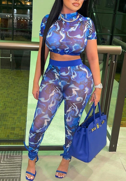 (Real Image)2022 Styles Women Fashion Summer TikTok&Instagram Styles Mesh Print Blue Two Piece SuitSKU: #CF47125-1