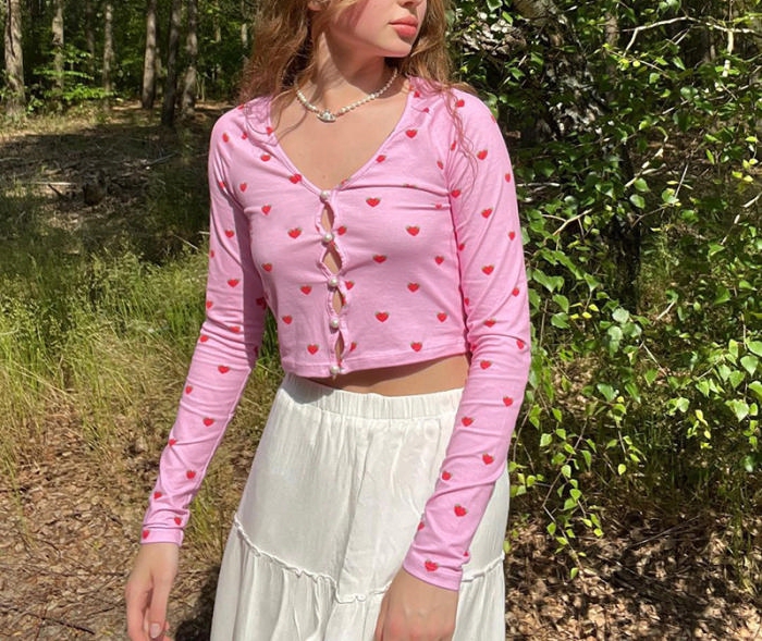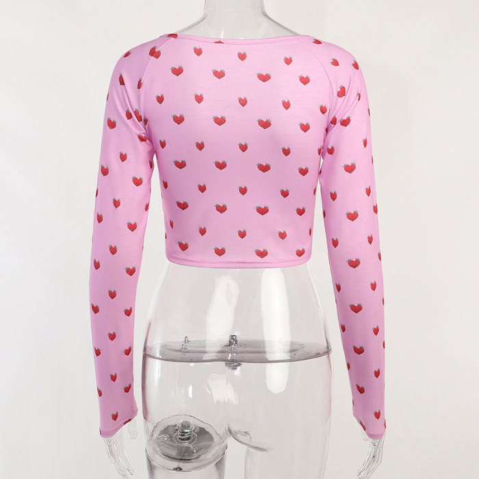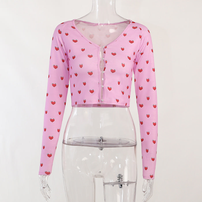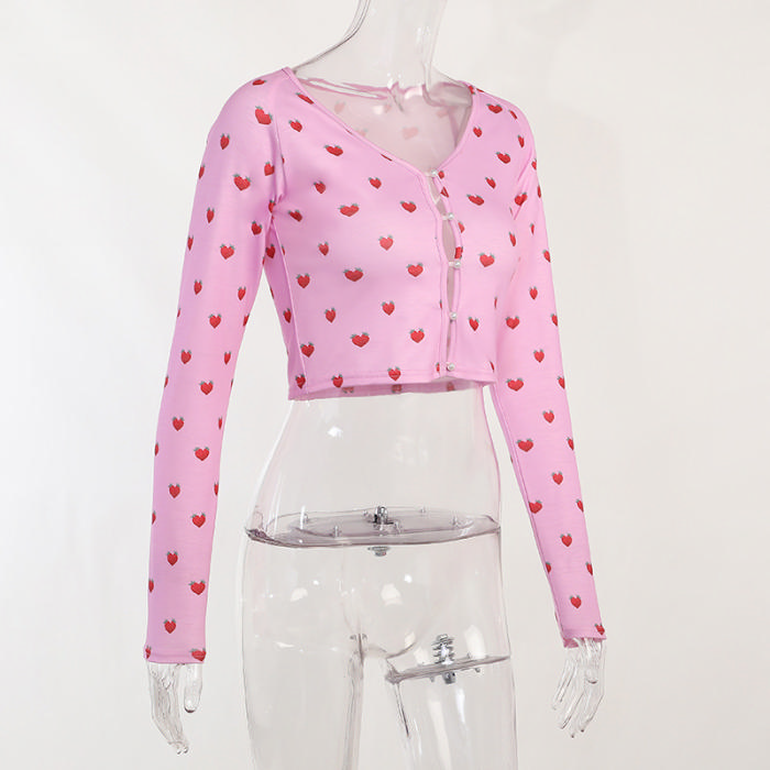 (Real Image)2022 Styles Women Fashion Summer TikTok&Instagram Styles Pink Front Button Strawberry ShirtsSKU: #XF92572-1