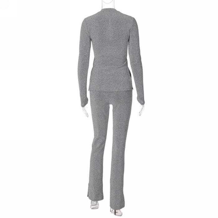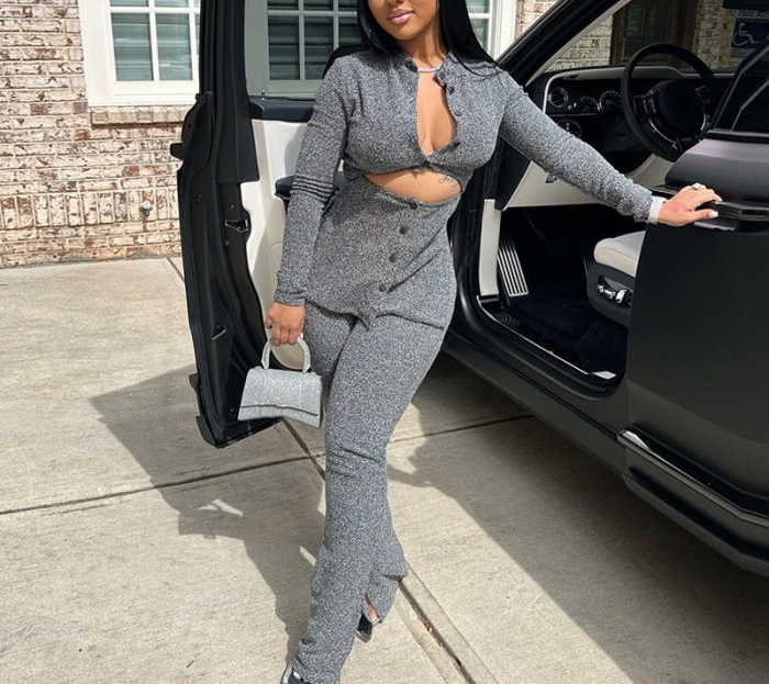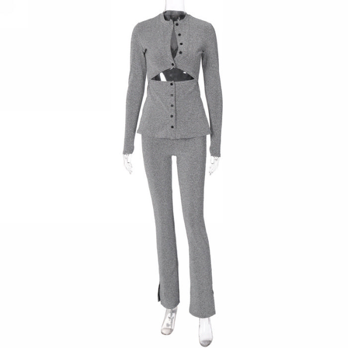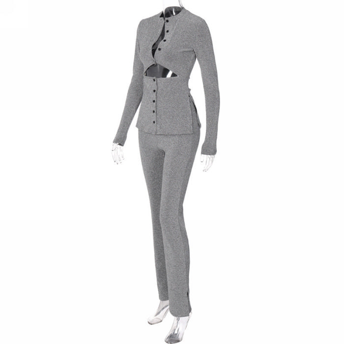 (Real Image)2022 Styles Women Fashion Summer TikTok&Instagram Styles Silver Cut Out Front Button Two Piece SuitSKU: #CF22764-1