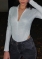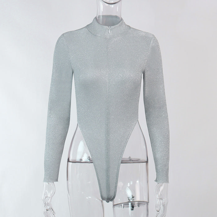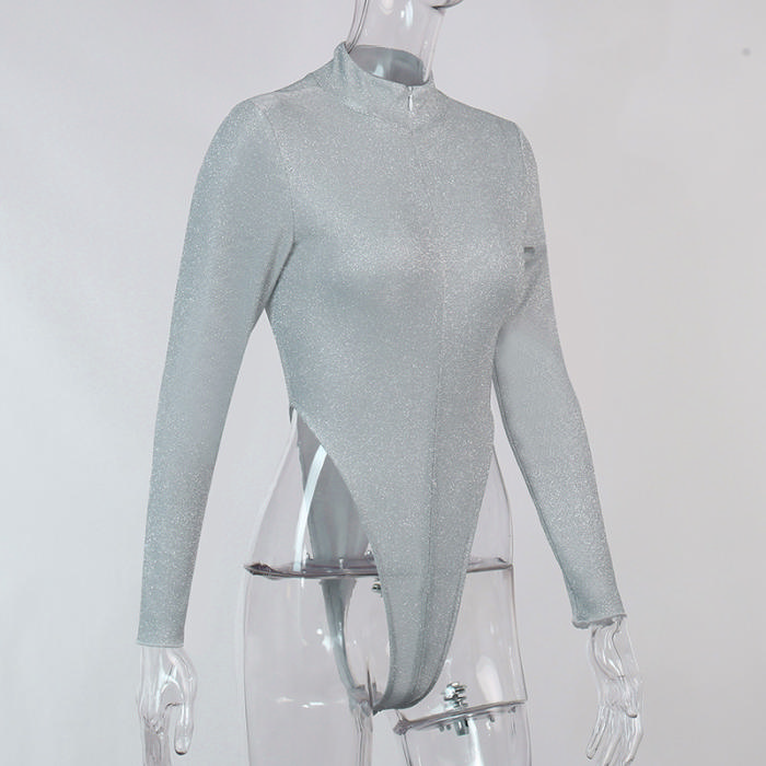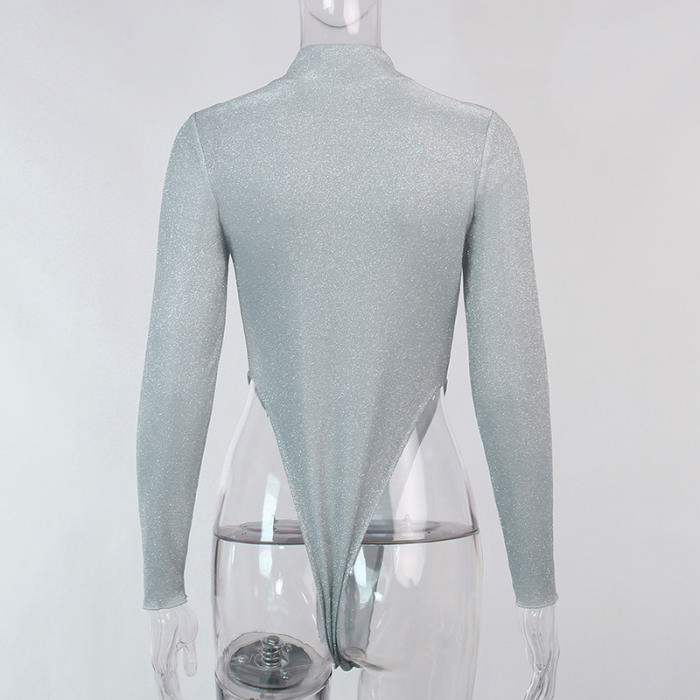 (Real Image)2022 Styles Women Fashion Summer TikTok&Instagram Styles Silver Long Sleeve BodysuitSKU: #XF92628-1