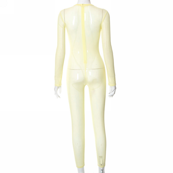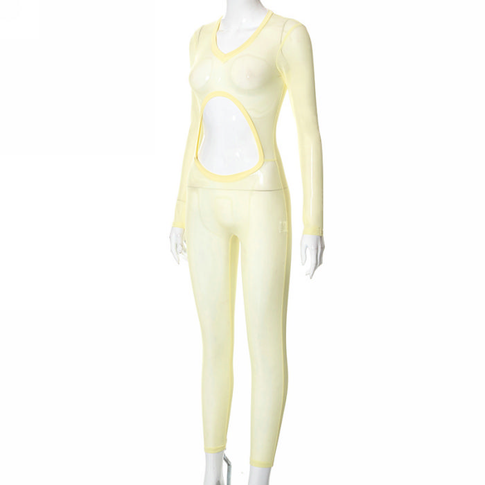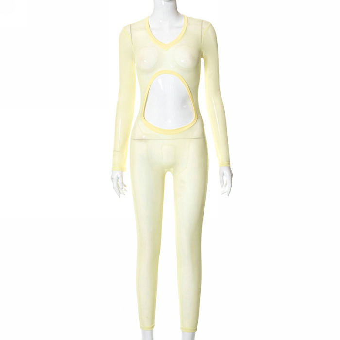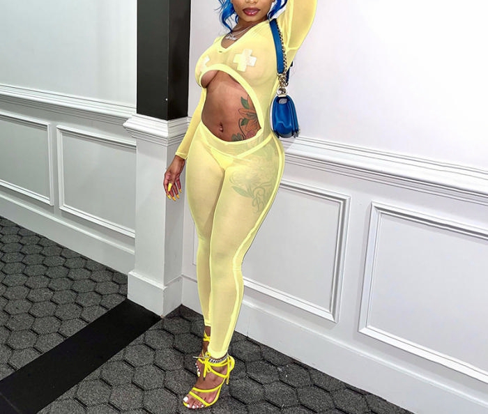 (Real Image)2022 Styles Women Fashion Summer TikTok&Instagram Styles Yellow Mesh Cut Out JumpsuitSKU: #CF47292-1