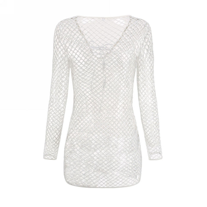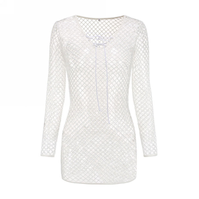 (Real Image)2022 Styles Women Sexy INS Styles Hollow Net Long Sleeve Mini DressSKU: #CF65001-1