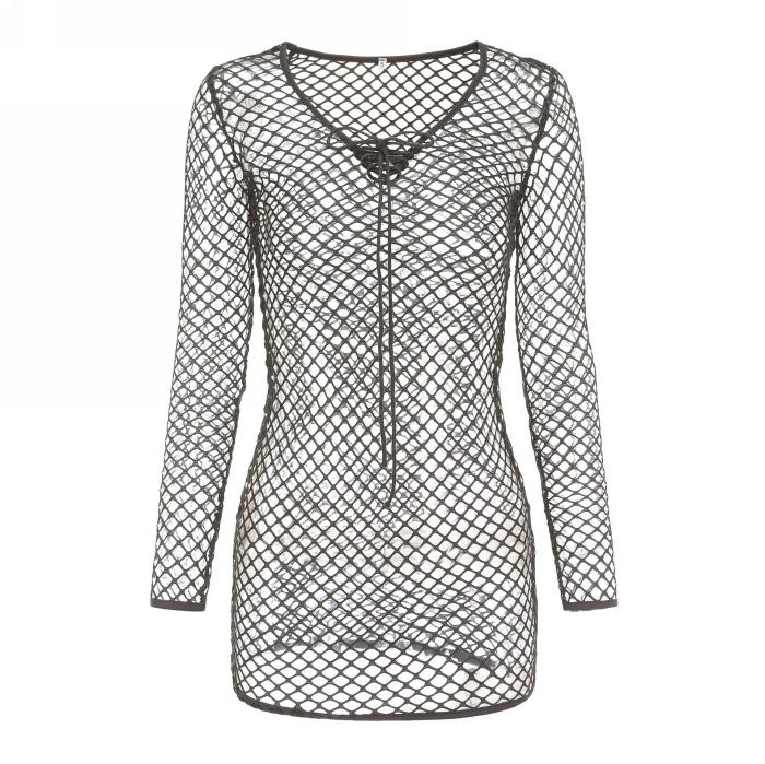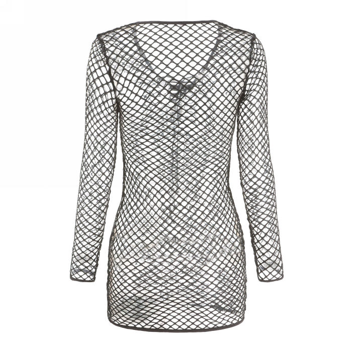 (Real Image)2022 Styles Women Sexy INS Styles Hollow Net Long Sleeve Mini DressSKU: #CF65001-2