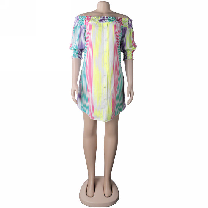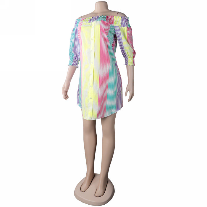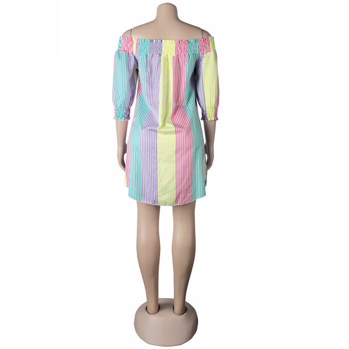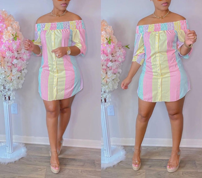 (Real Image)2022 Styles Women Sexy INS Styles Off Shoulder Striped Casual Mini DressSKU: #XF27225-4