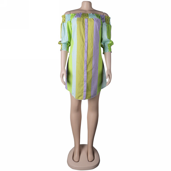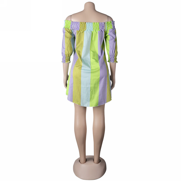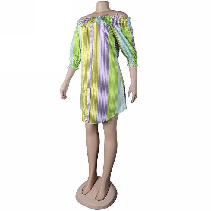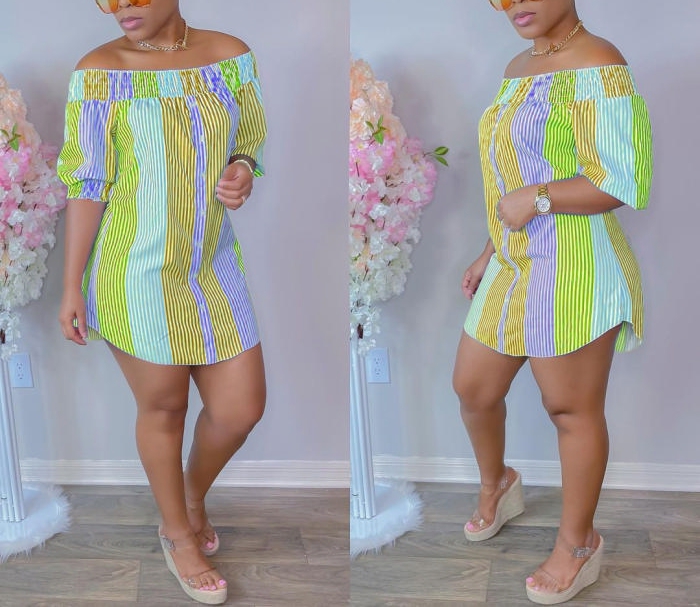 (Real Image)2022 Styles Women Sexy INS Styles Off Shoulder Striped Casual Mini DressSKU: #XF27225-2