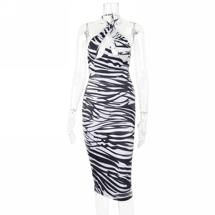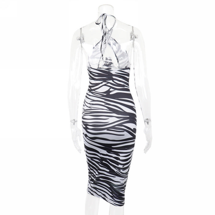(Real Image)2022 Styles Women Sexy INS Styles Print Zebra Halter Midi DressSKU: #CF67017-1
