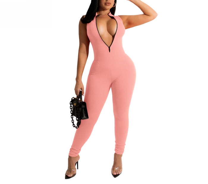 (Real Image)2022 Styles Women Sexy INS Styles Solid Color Front Zipper JumpsuitSKU: #XF02163-2