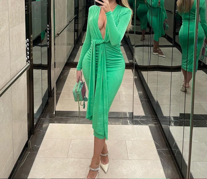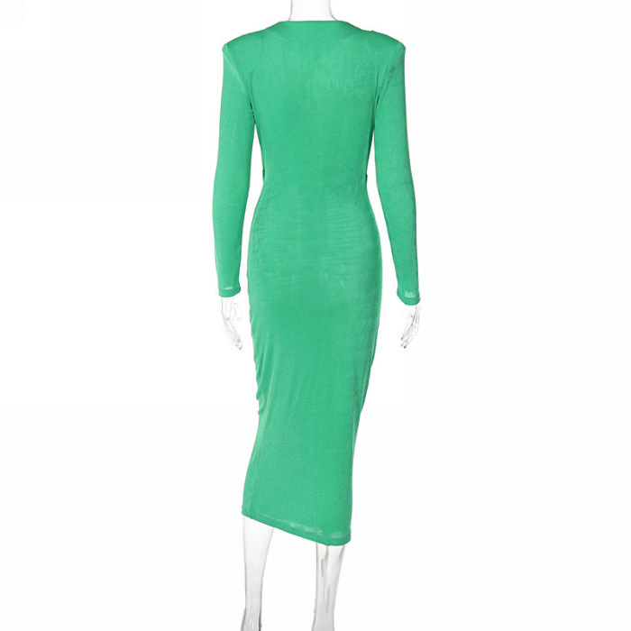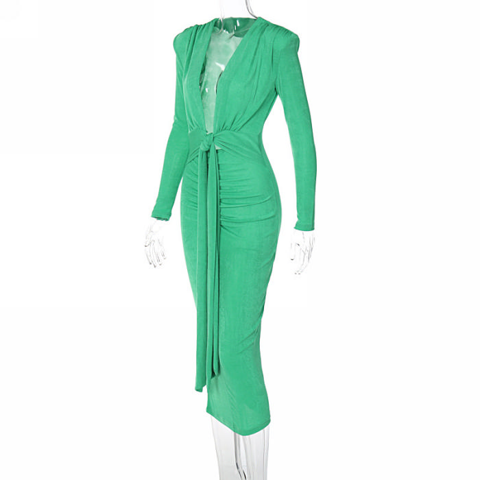 (Real Image)2022 Styles Women Sexy Spring&Winter TikTok&Instagram Styles Green Deep V Neck Long Sleeve Maxi DressSKU: #CF81028-1