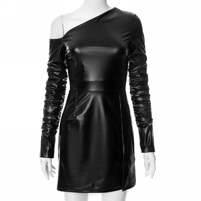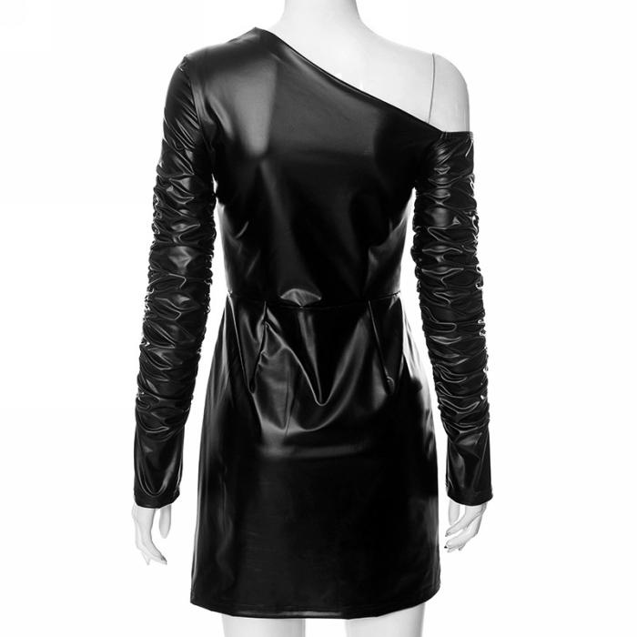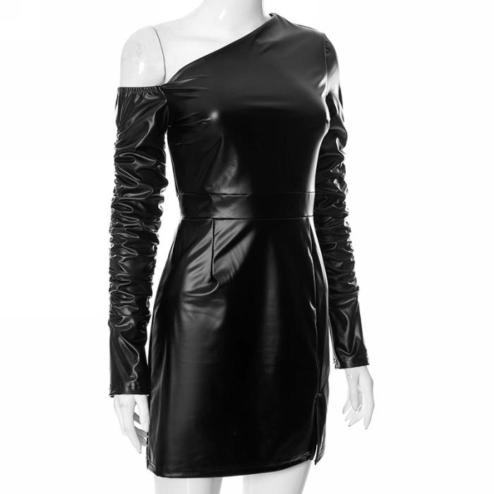 (Real Image)2022 Styles Women Sexy Spring&Winter TikTok&Instagram Styles PU Single Shoulder Mini DressSKU: #CF68183-1
