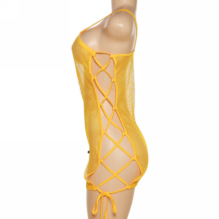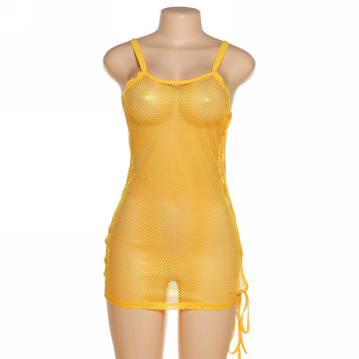 (Real Image)2022 Styles Women Sexy Summer TikTok&Instagram Styles Yellow Net Double Lace Up Mini DressSKU: #CF48799-1