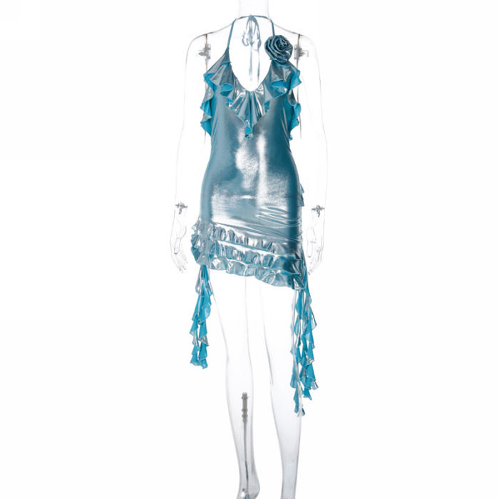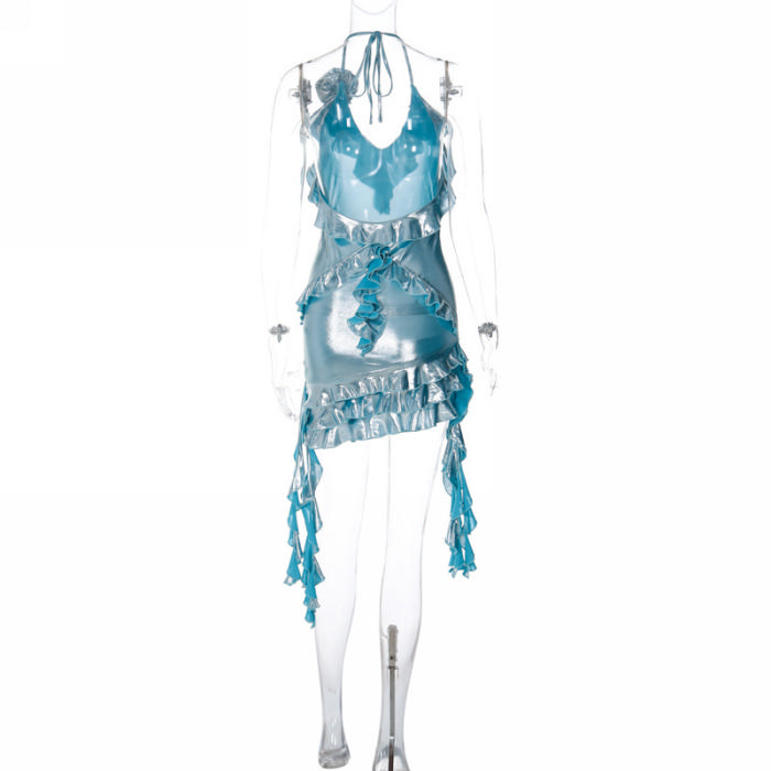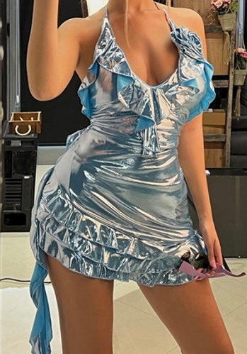 (Real Image)2023 Styles Women Sexy&Fashion Autumn/Winter TikTok&Instagram Styles Halter Blue Ruffle Mini DressSKU: #CF88168-1