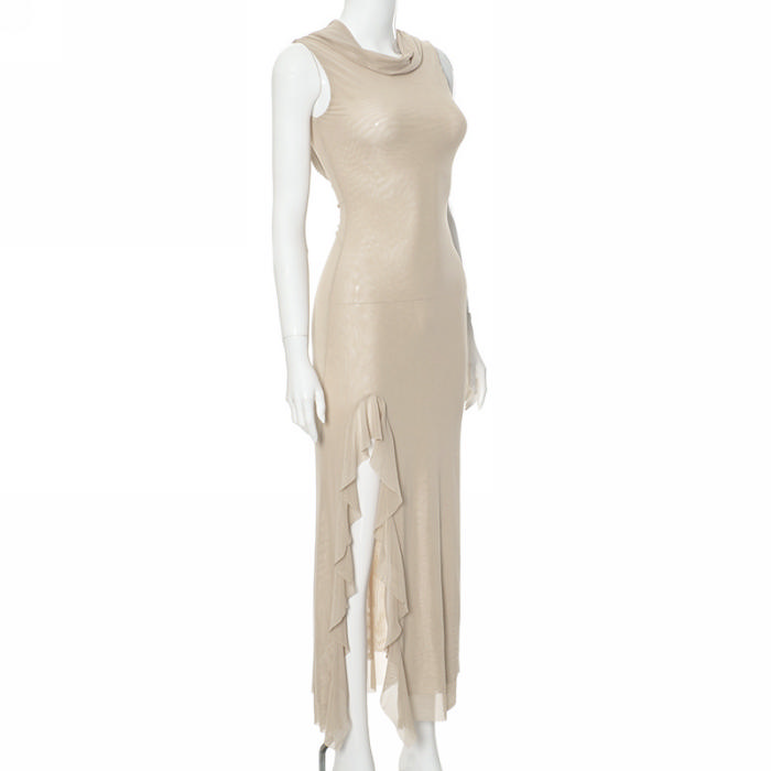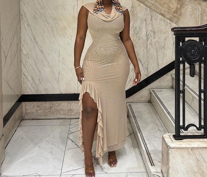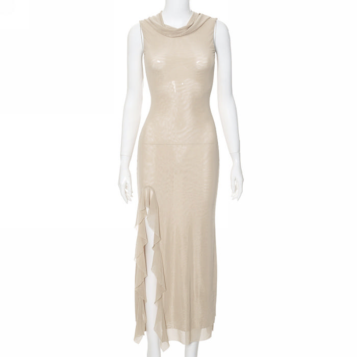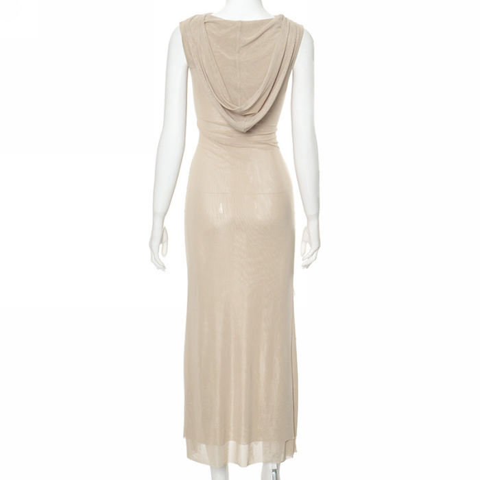 (Real Image)2023 Styles Women Sexy&Fashion Autumn/Winter TikTok&Instagram Styles Khaki Mesh Hoodie Maxi DressSKU: #CF47805-1