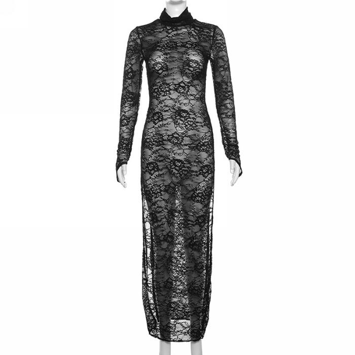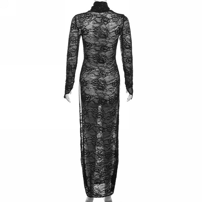 (Real Image)2023 Styles Women Sexy&Fashion Autumn/Winter TikTok&Instagram Styles Lace Long Sleeve High Split Maxi DressSKU: #CF83245-1
