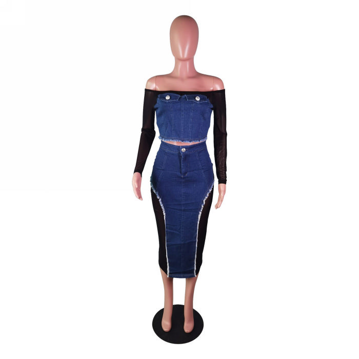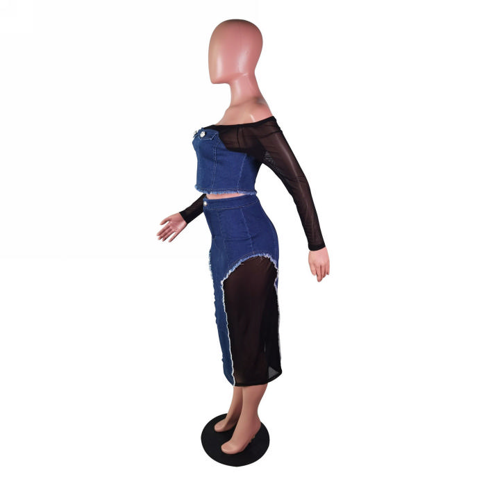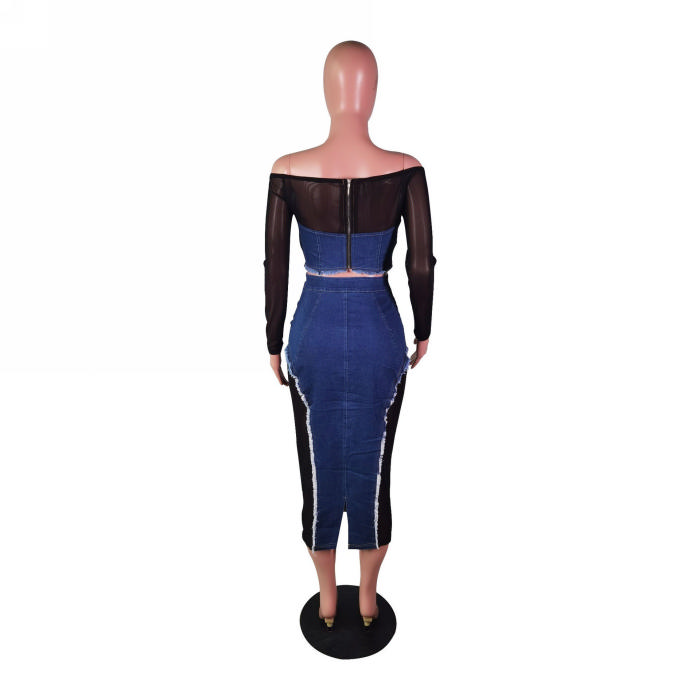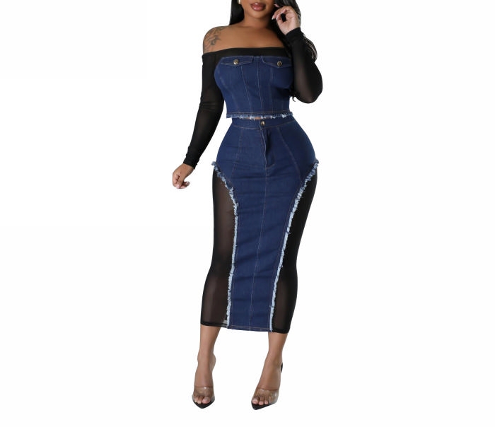 (Real Image)2023 Styles Women Sexy&Fashion Autumn/Winter TikTok&Instagram Styles Long SLeeve Jeans Mesh Maxi DressSKU: #OEM6000-1