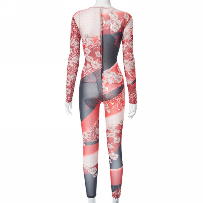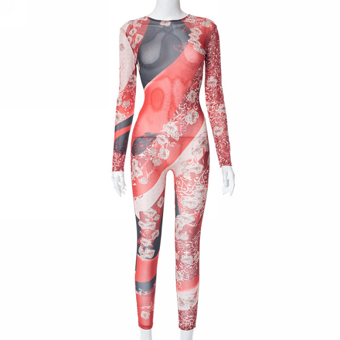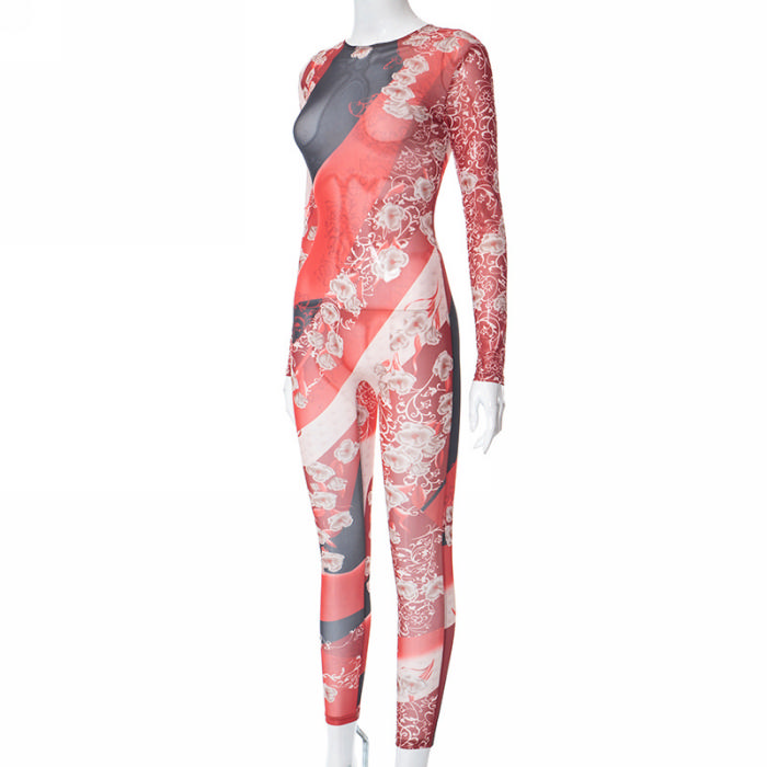(Real Image)2023 Styles Women Sexy&Fashion Autumn/Winter TikTok&Instagram Styles Print Mesh JumpsuitSKU: #CF47766-1