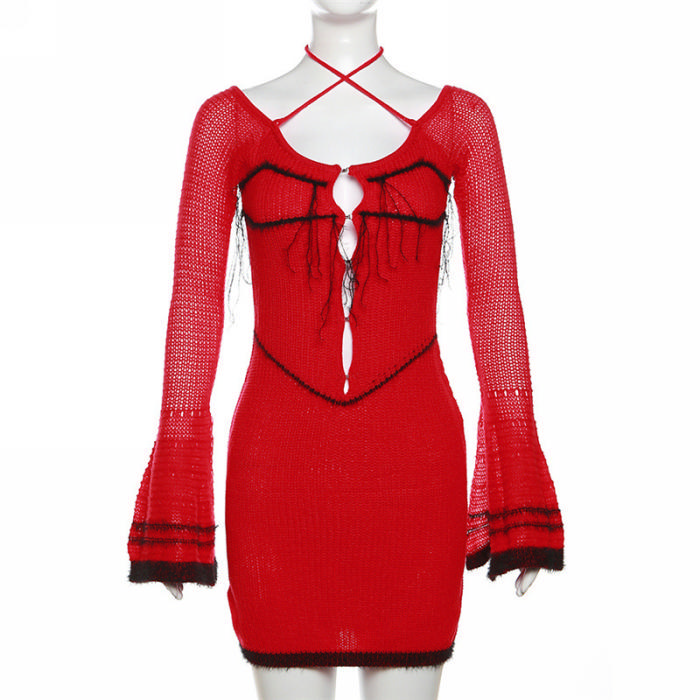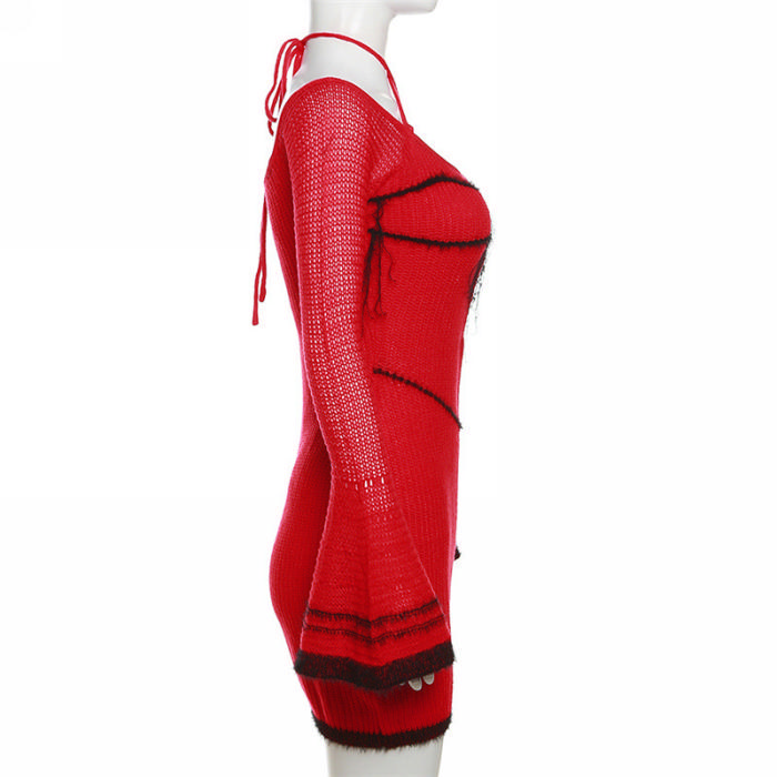 (Real Image)2023 Styles Women Sexy&Fashion Autumn/Winter TikTok&Instagram Styles Red Sweater Long Sleeve Mini DressSKU: #CF77654-1