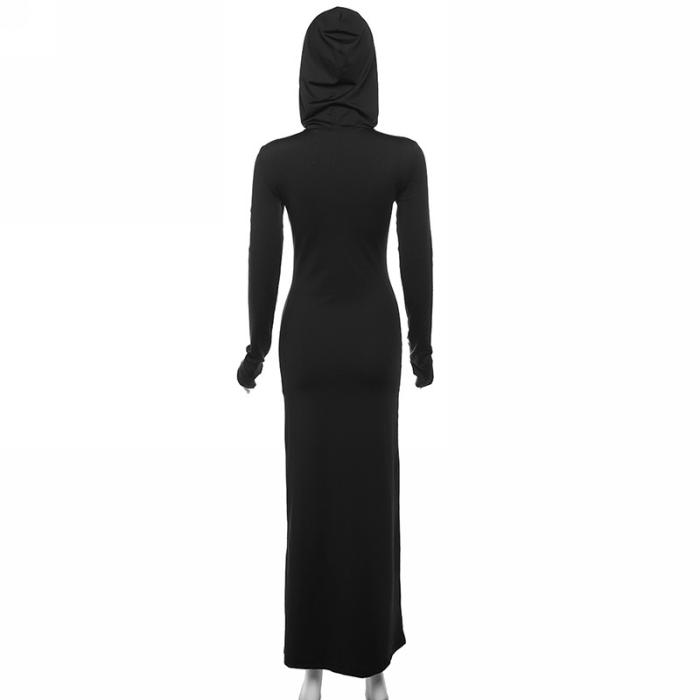 (Real Image)2023 Styles Women Sexy&Fashion Spring&Summer TikTok&Instagram Styles Black Hoodie Long Sleeve Maxi DressSKU: #CF77500-1