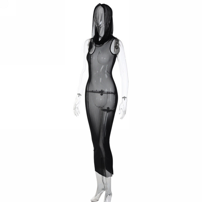 (Real Image)2023 Styles Women Sexy&Fashion Spring&Summer TikTok&Instagram Styles Black Hoodie Mesh Maxi DressSKU: #CF38212-1
