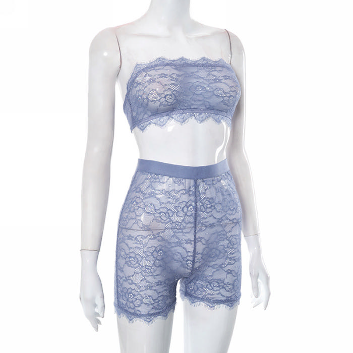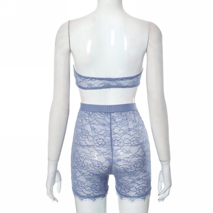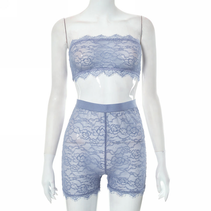 (Real Image)2023 Styles Women Sexy&Fashion Spring&Summer TikTok&Instagram Styles Blue Lace Short Two Piece SuitSKU: #CF47541-1