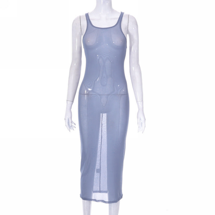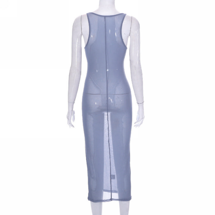 (Real Image)2023 Styles Women Sexy&Fashion Spring&Summer TikTok&Instagram Styles Blue Mesh Maxi DressSKU: #CF68233-1