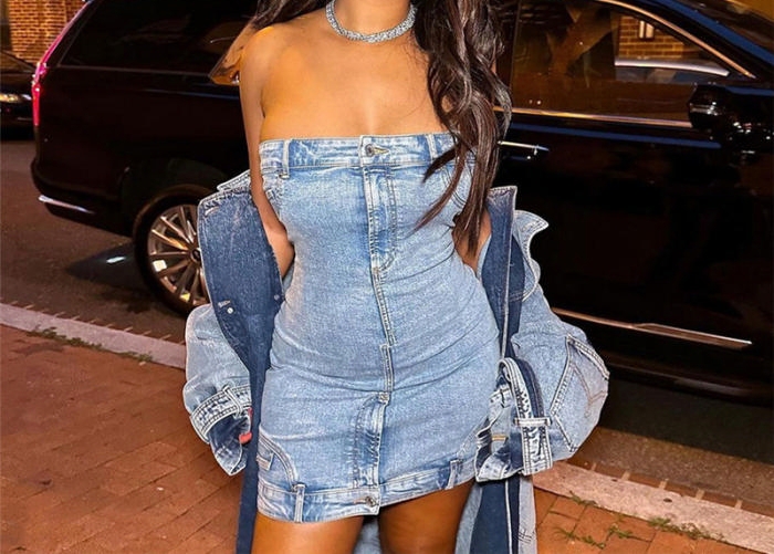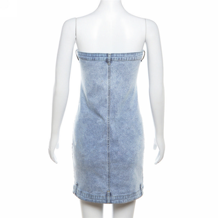 (Real Image)2023 Styles Women Sexy&Fashion Spring&Summer TikTok&Instagram Styles Blue Tube Jeans Mini DressSKU: #CF77509-1