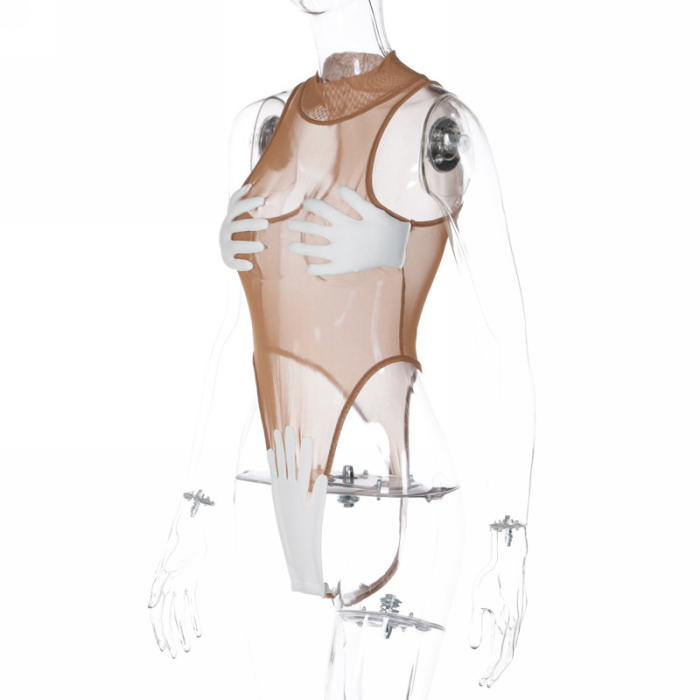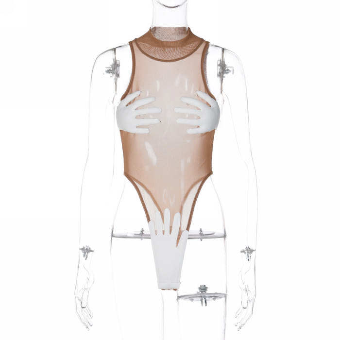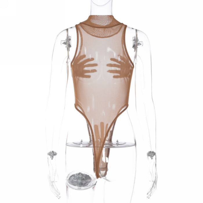 (Real Image)2023 Styles Women Sexy&Fashion Spring&Summer TikTok&Instagram Styles Coffee Mesh BodysuitSKU: #CF88109-1