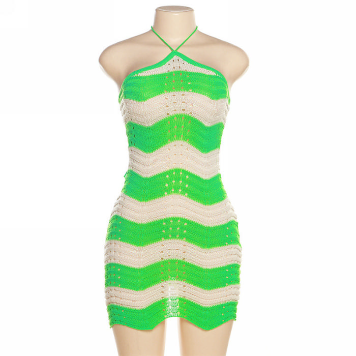 (Real Image)2023 Styles Women Sexy&Fashion Spring&Summer TikTok&Instagram Styles Green Contrast Color Halter Mini DressSKU: #CF77320-1