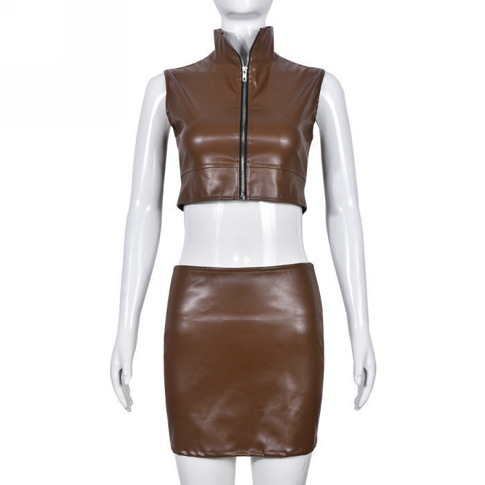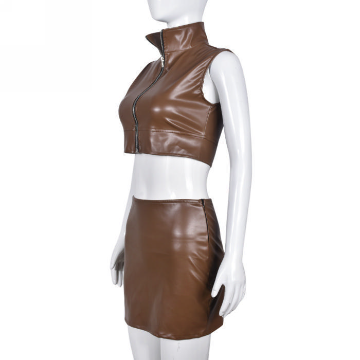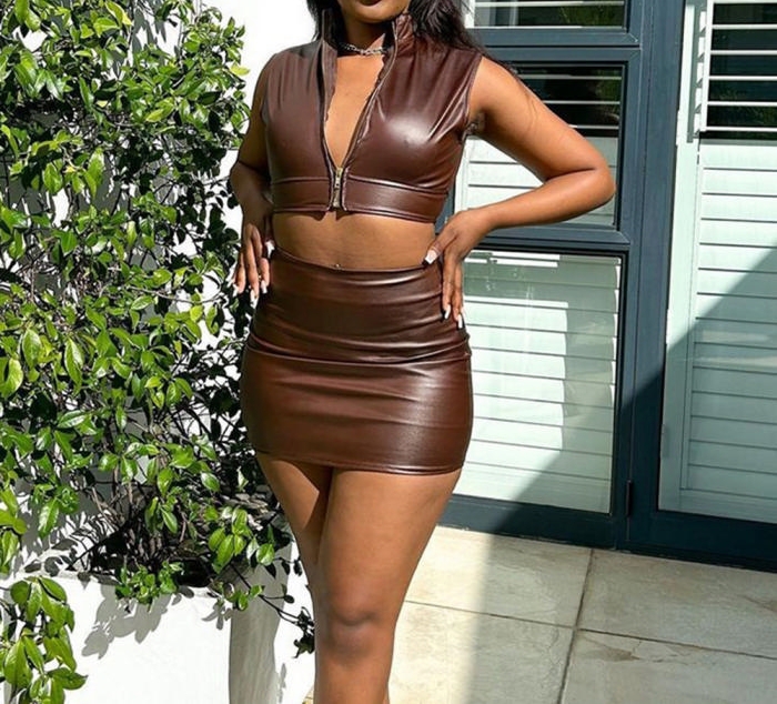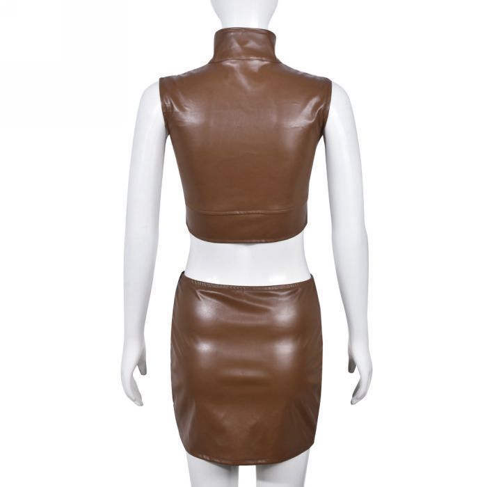 (Real Image)2023 Styles Women Sexy&Fashion Spring&Summer TikTok&Instagram Styles PU Coffee Two Piece DressSKU: #CF59512-1
