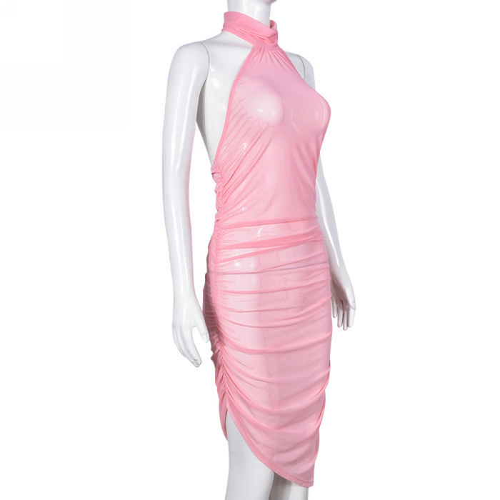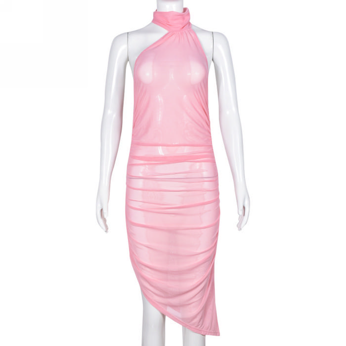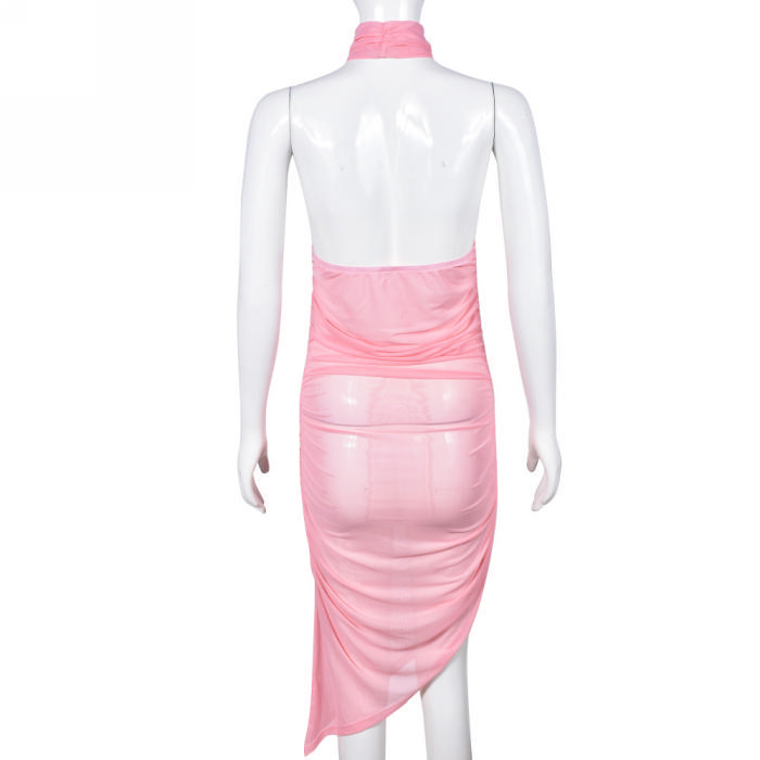 (Real Image)2023 Styles Women Sexy&Fashion Spring&Summer TikTok&Instagram Styles Pink Mesh Irregular Backless Midi DressSKU: #CF59498-1