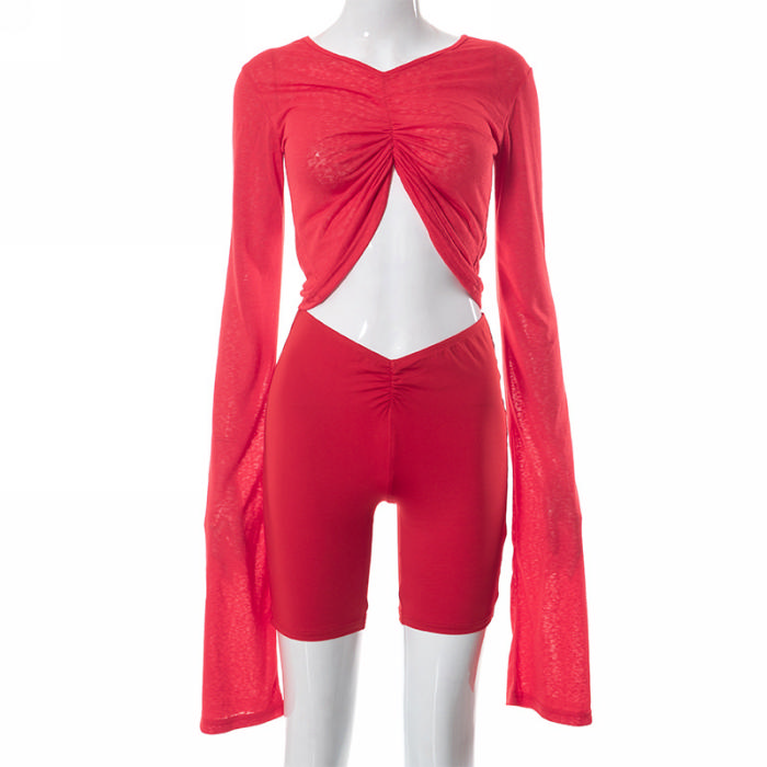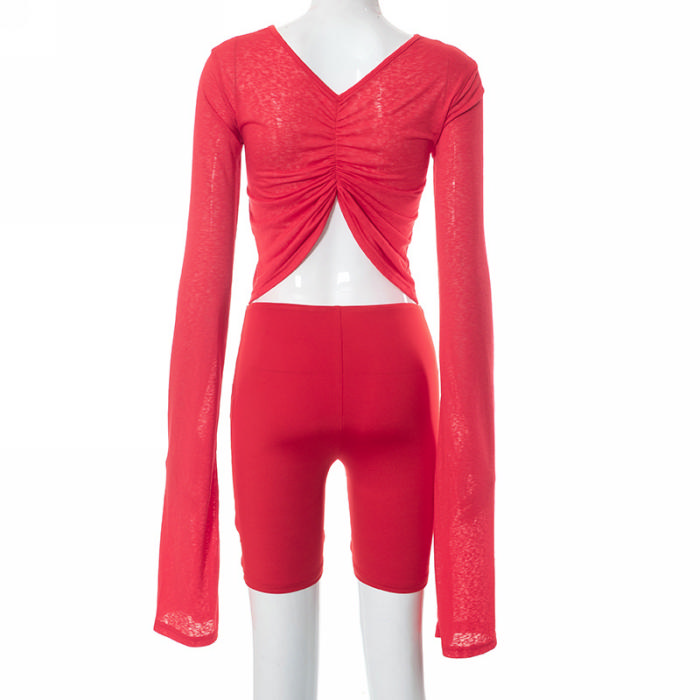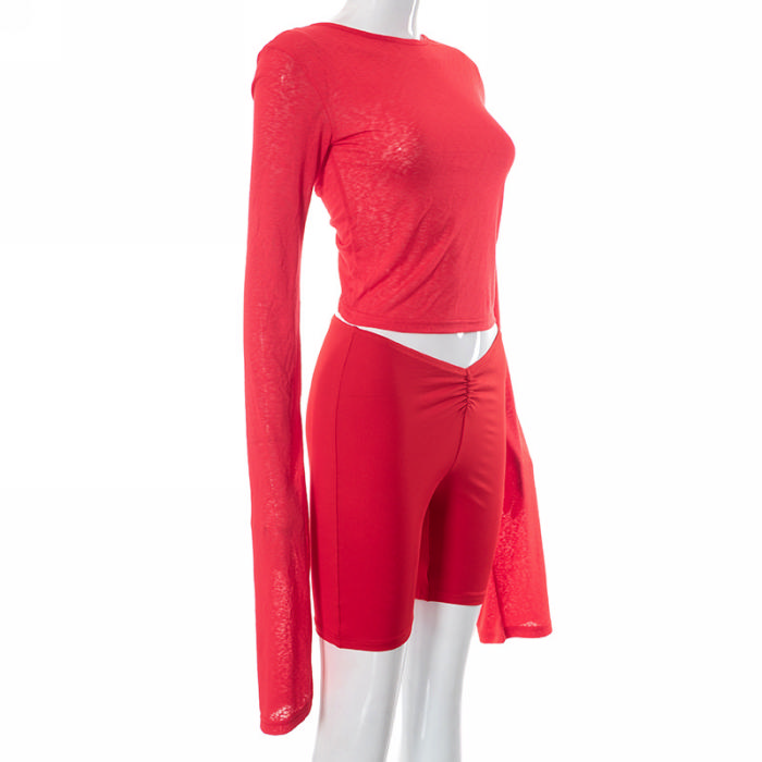 (Real Image)2023 Styles Women Sexy&Fashion Spring&Summer TikTok&Instagram Styles Red Long Sleeve Short Two Piece SuitSKU: #CF47589-1