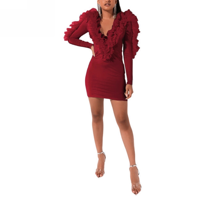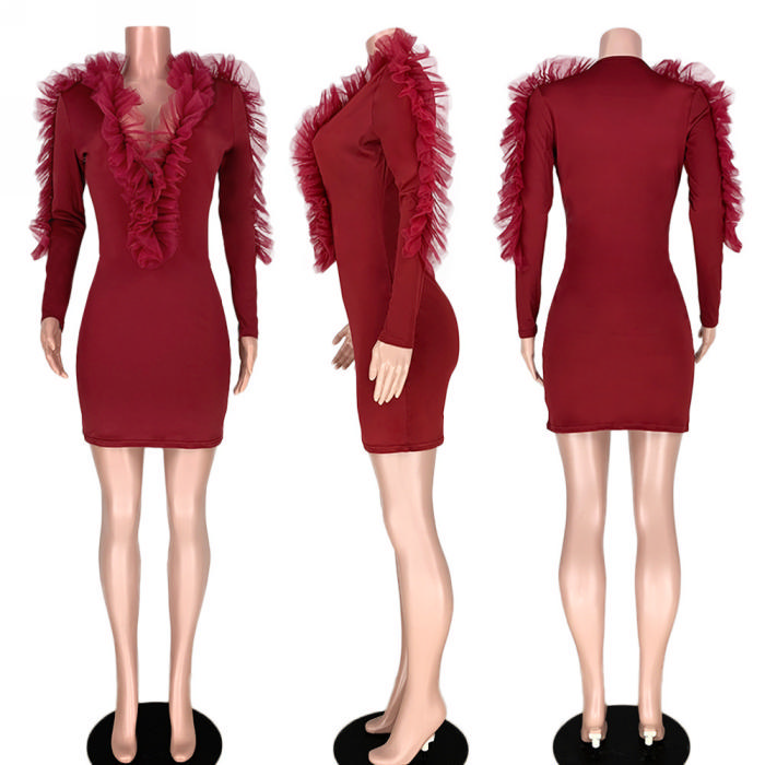 (Real Image)2023 Styles Women Sexy&Fashion Spring&Summer TikTok&Instagram Styles Ruffle V Neck Long Sleeve Mini DressSKU: #OEM5887-2