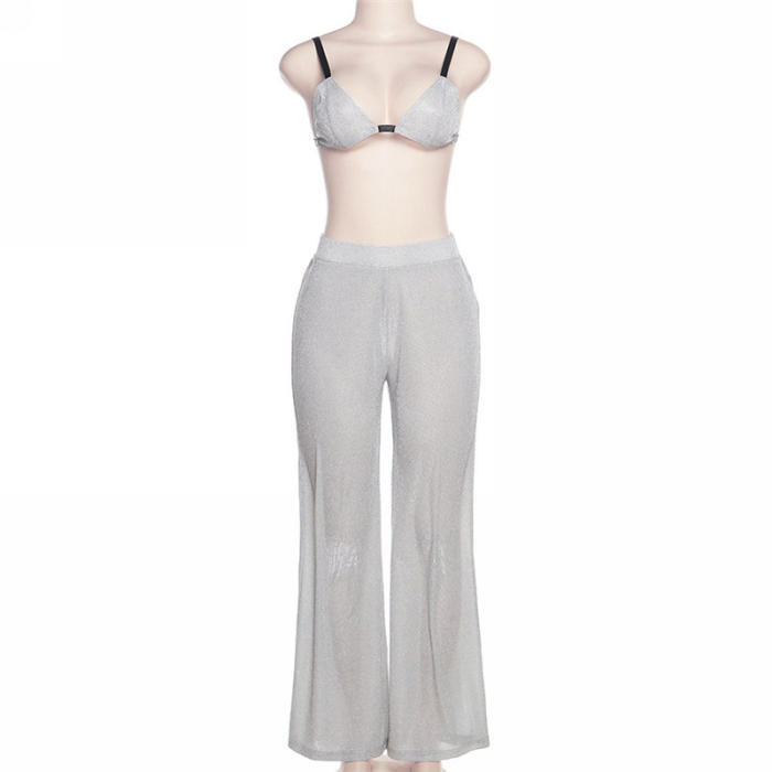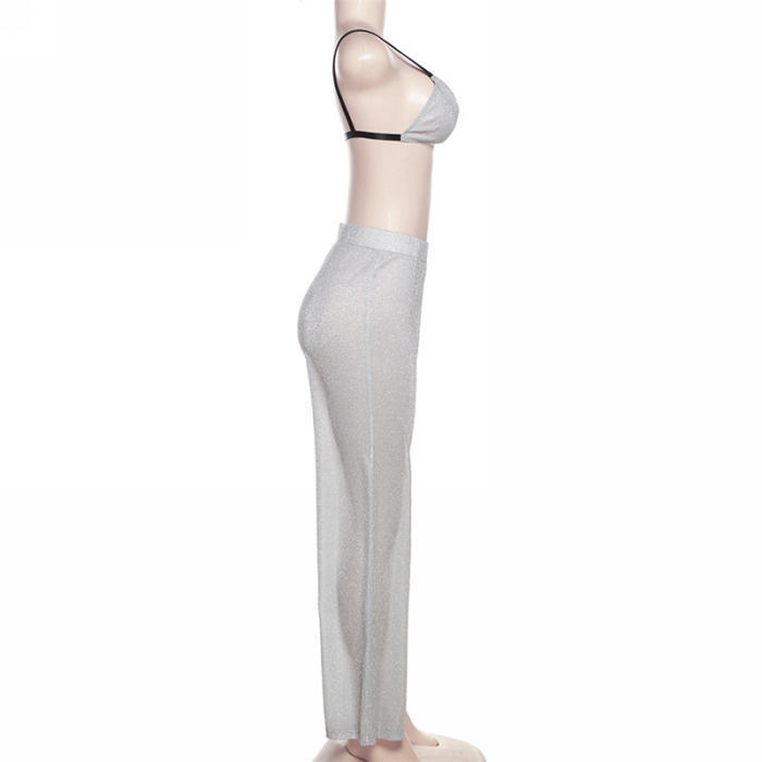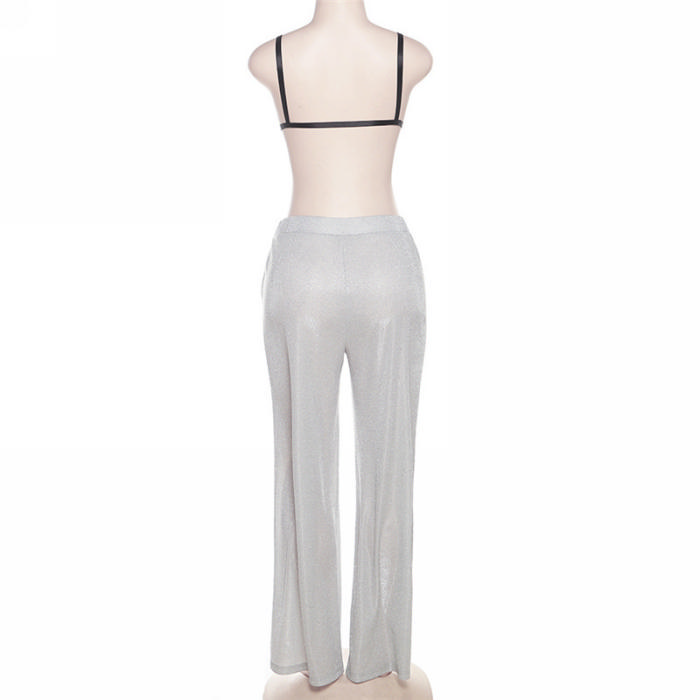 (Real Image)2023 Styles Women Sexy&Fashion Spring&Summer TikTok&Instagram Styles Silver Bar+Long Pants Two Piece SuitSKU: #CF83067-1