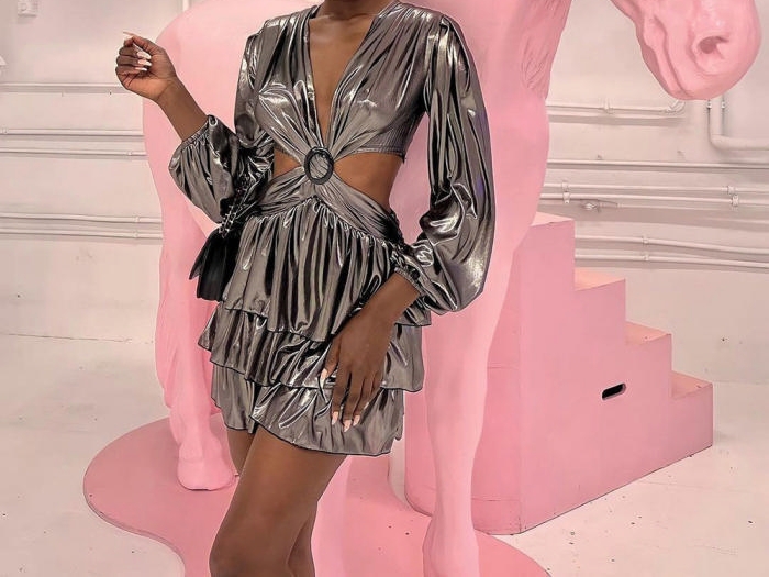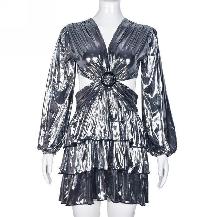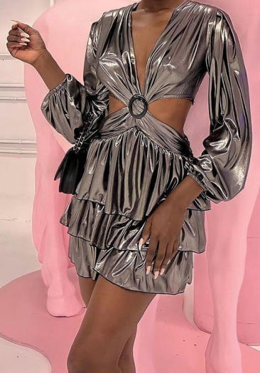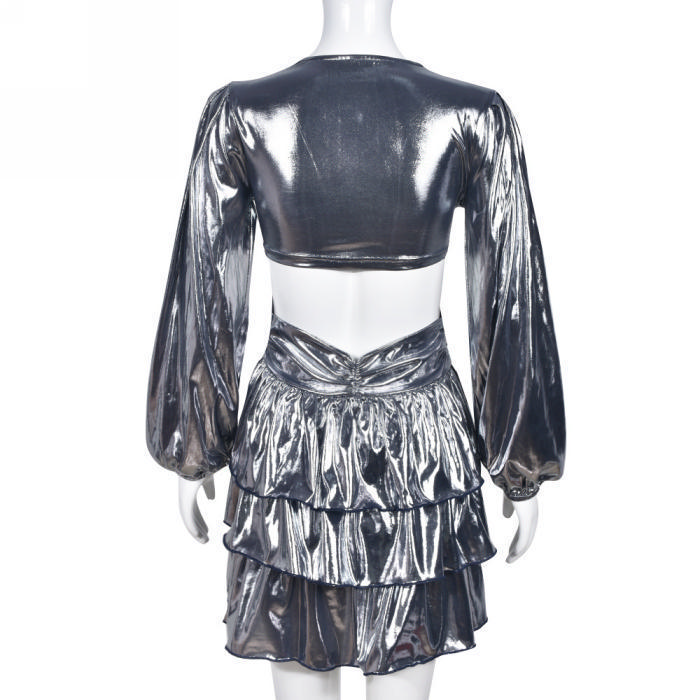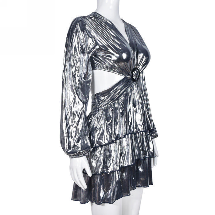 (Real Image)2023 Styles Women Sexy&Fashion Spring&Summer TikTok&Instagram Styles Silver Puff Long Sleeve Hem Mini DressSKU: #CF59500-1