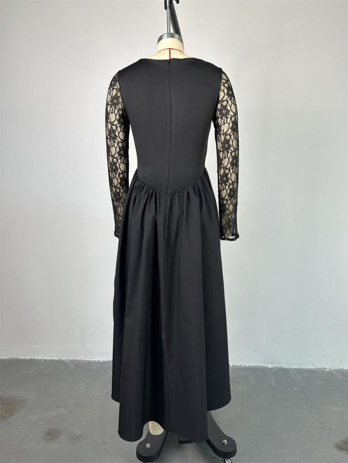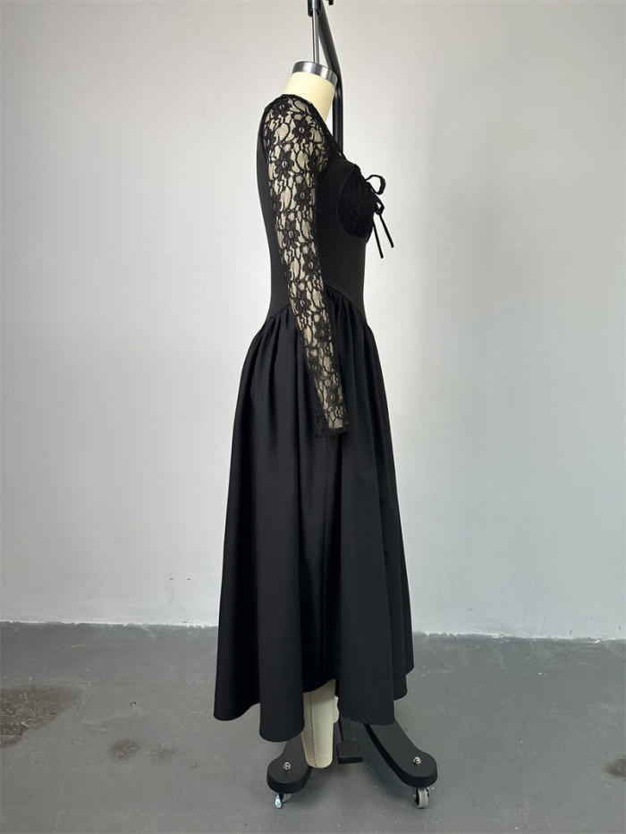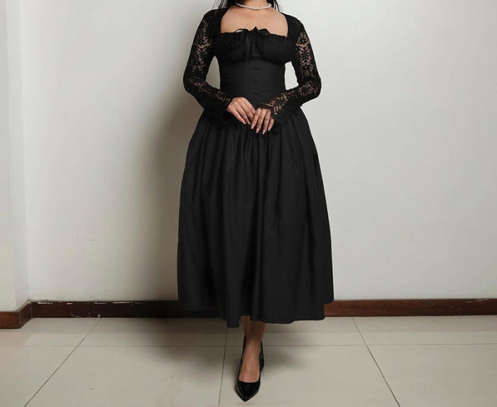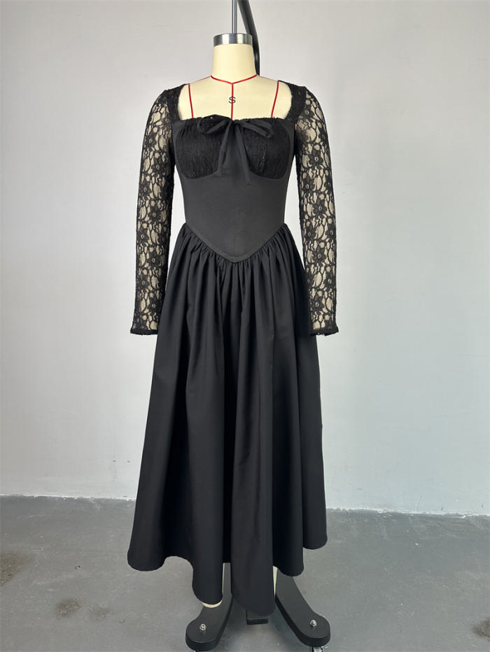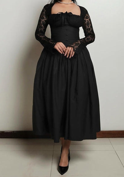 (Real Image)2024 Styles Plus Size Women Spring Elegant Square Neck Lace Long Sleeve Waist-Cinching Solid Color Mid-Length DressSKU: #CF91038-1