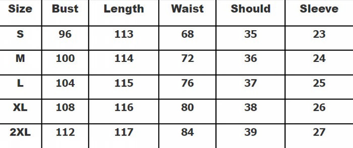 | Size | Bust | Waist | Hips |