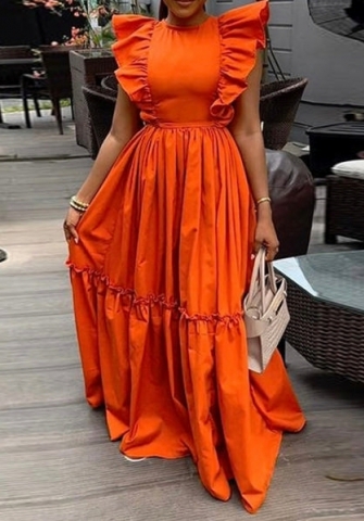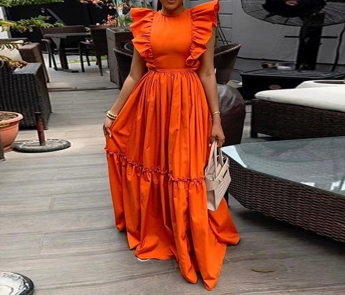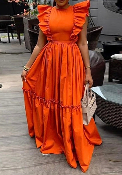 (Real Image)2024 Styles Plus Size Women Summer Elegant Ruffle Sleeve Round Neck Waist-Cinch Long A-Line DressSKU: #CF91075-1