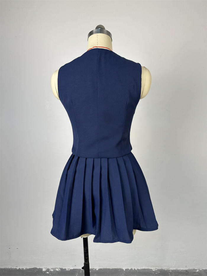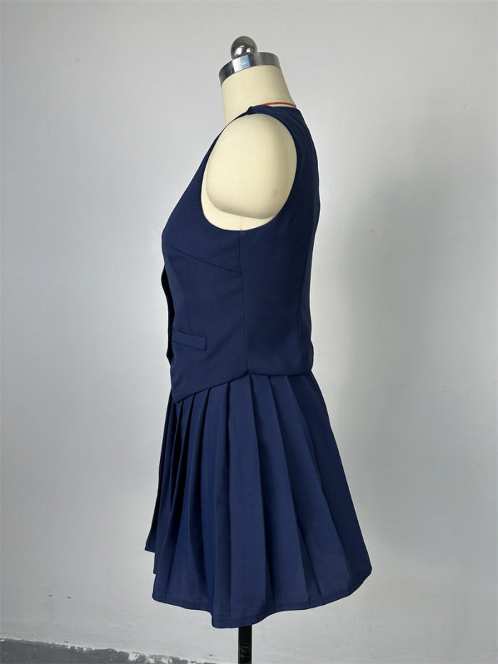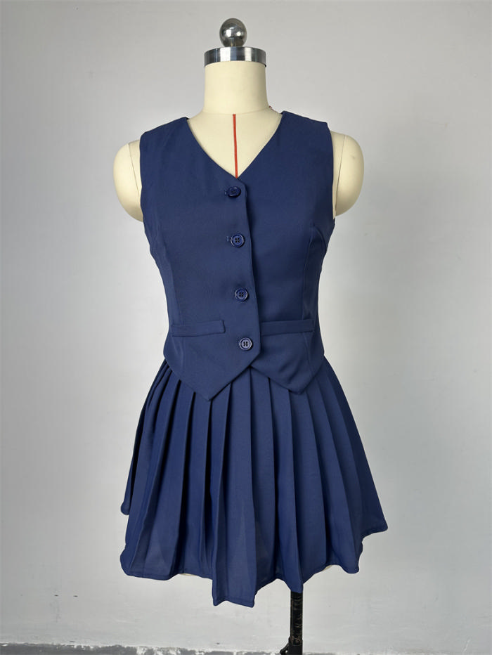(Real Image)2024 Styles Plus Size Women Summer Solid Color V-Neck Sleeveless Vest Top with Pleated Skirt SetSKU: #CF91037-1