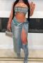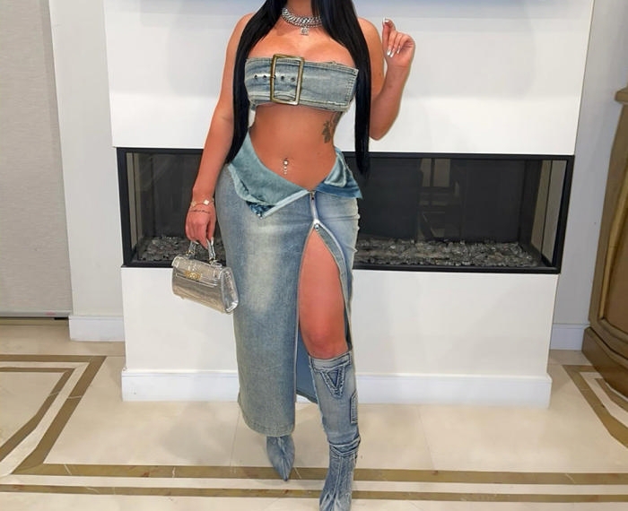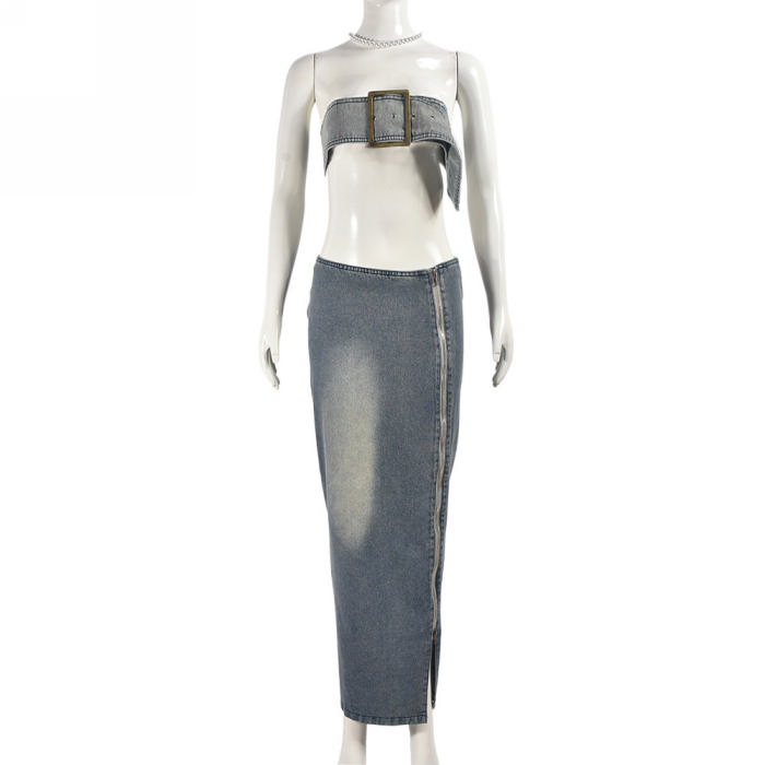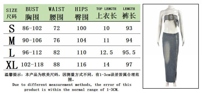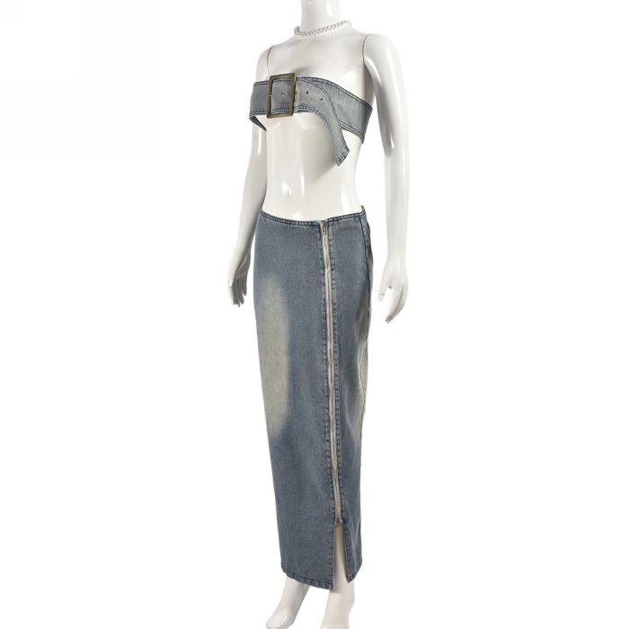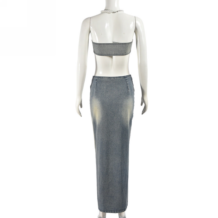 (Real Image)2024 Styles Women Adjustable Vest and Long Skirt Sexy Vintage Denim SetSKU: #CF59817-1
