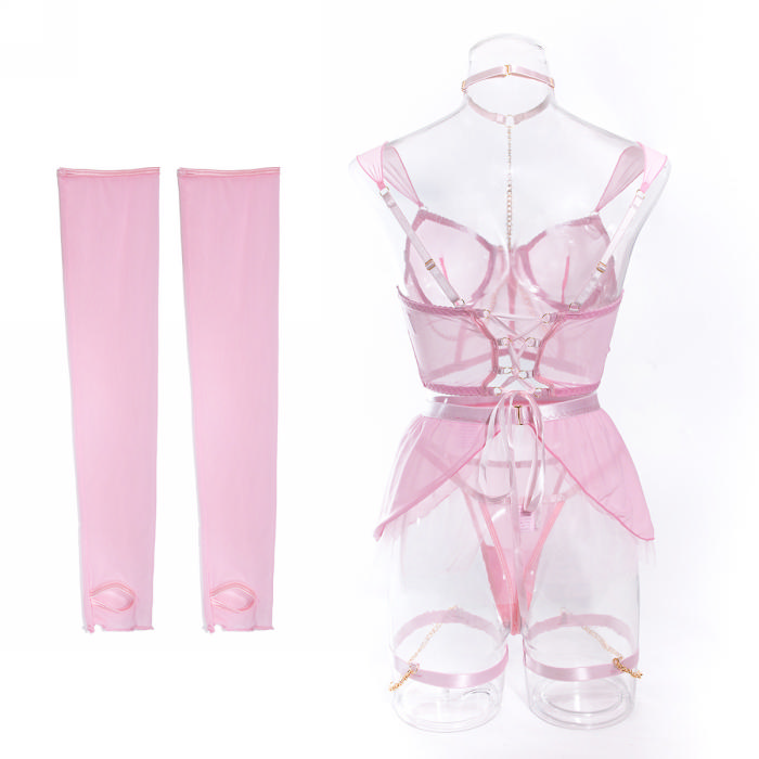 (Real Image)2024 Styles Women Adorable Sheer Tulle Skirt with Chain Halter and Gloves Four-Piece SetSKU: #GF03017-1