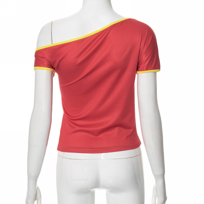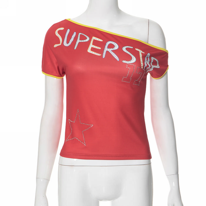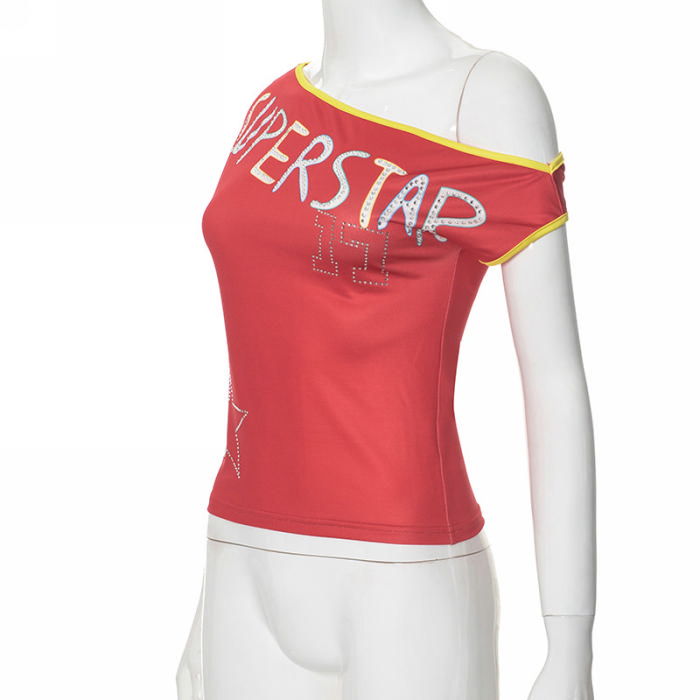 (Real Image)2024 Styles Women Asymmetrical Shoulder Rhinestone-Embellished Exposed Waist Cool T-ShirtSKU: #CF92141-1