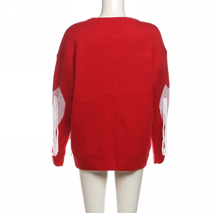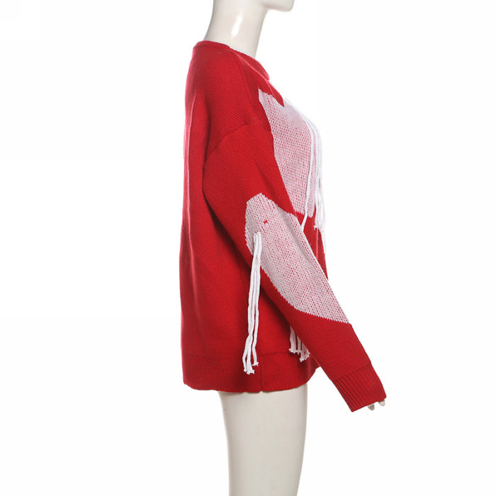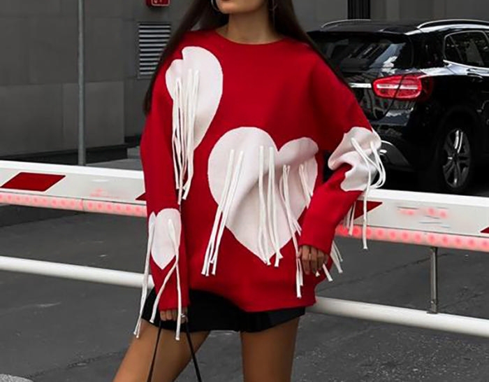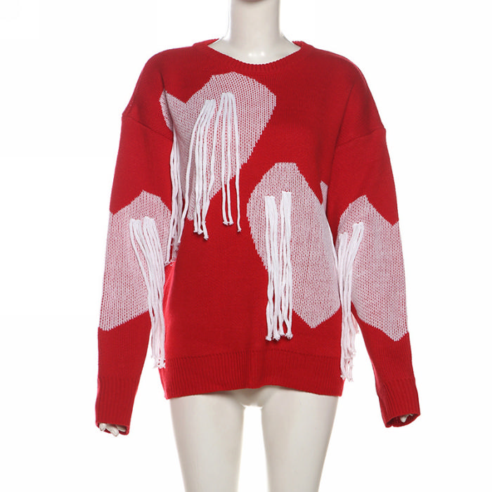 (Real Image)2024 Styles Women Autumn/Winter Long Sleeve Heart Tassel Loose Round Neck Pullover SweaterSKU: #CF83423-1