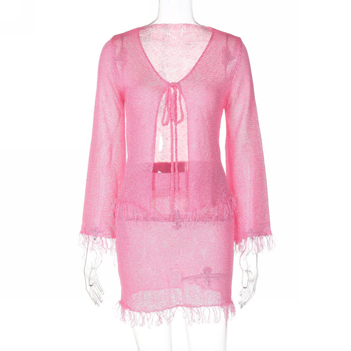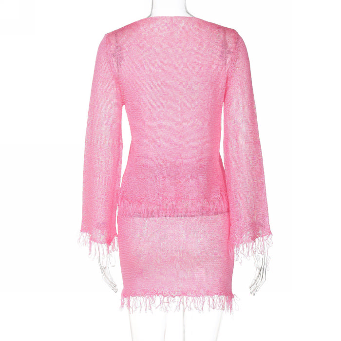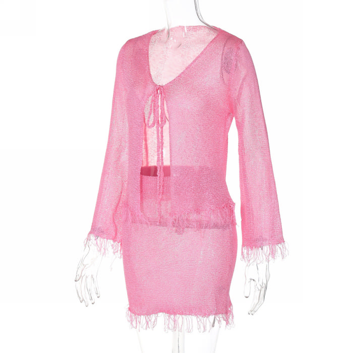 (Real Image)2024 Styles Women Autumn/Winter Sexy Lace-Up Cardigan & Fringed Skirt SetSKU: #CF88312-1