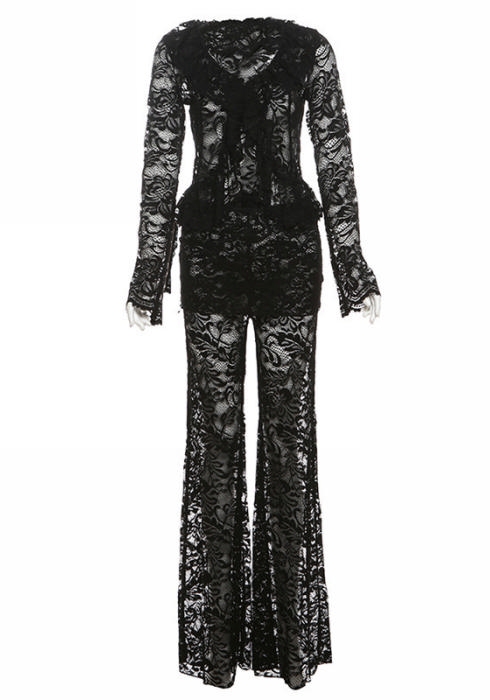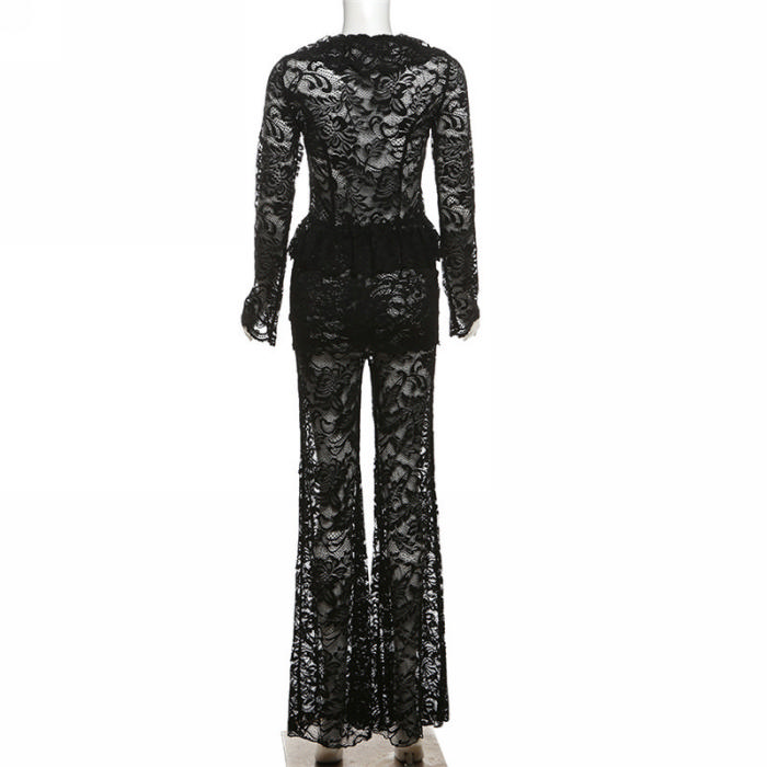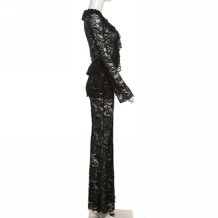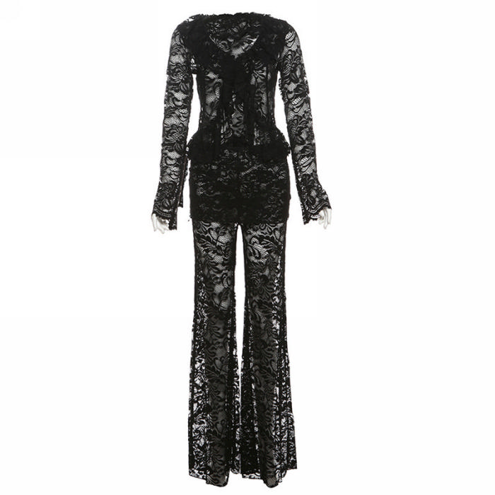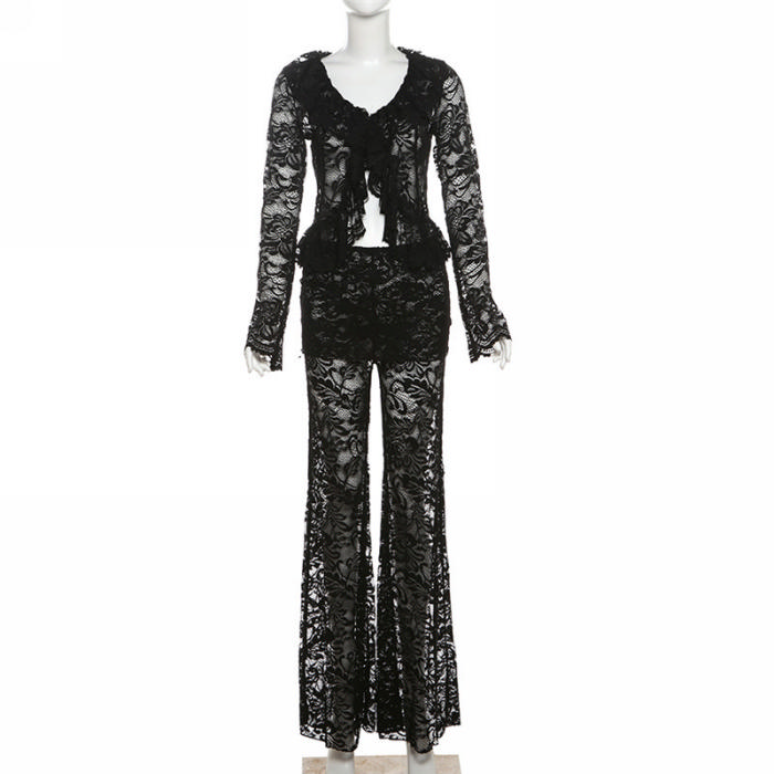 (Real Image)2024 Styles Women Autumn/Winter Sexy Sheer Long Sleeve Cardigan & High-Waist Flared Pants SetSKU: #CF77862-1