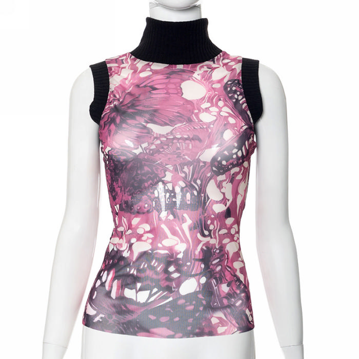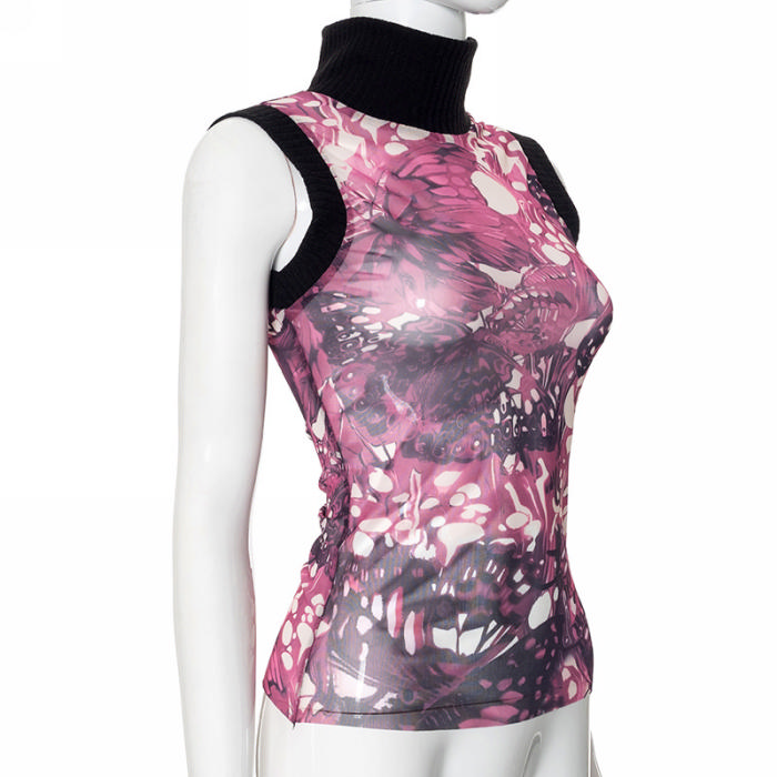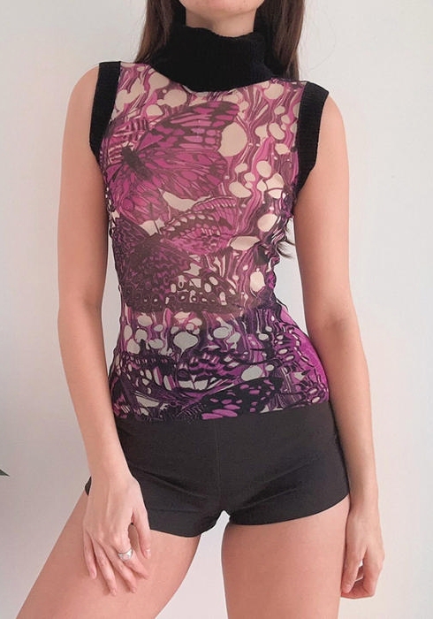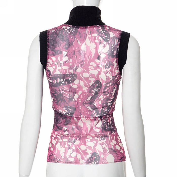 (Real Image)2024 Styles Women Butterfly Print Mesh Paneled Sleeveless Half-High Neck TopSKU: #CF76140-1