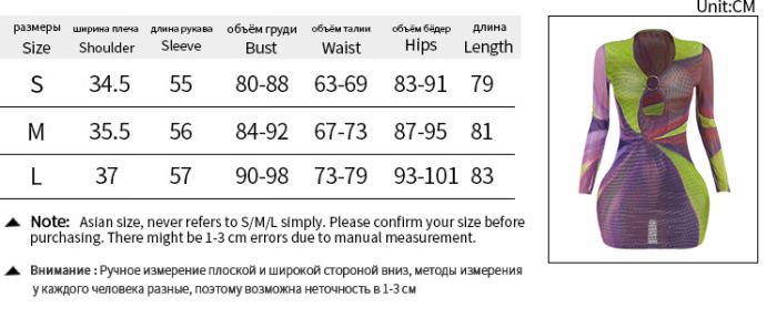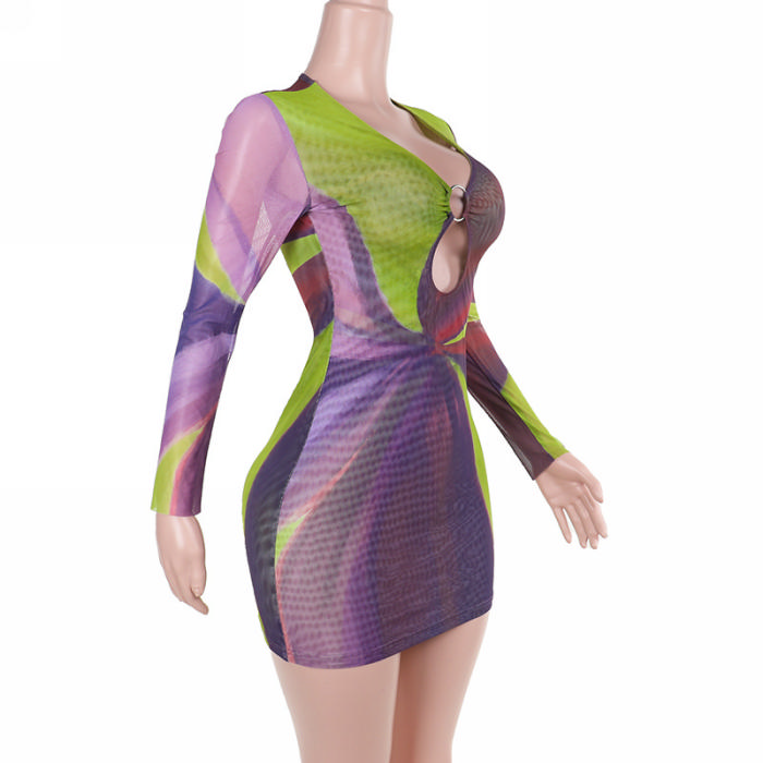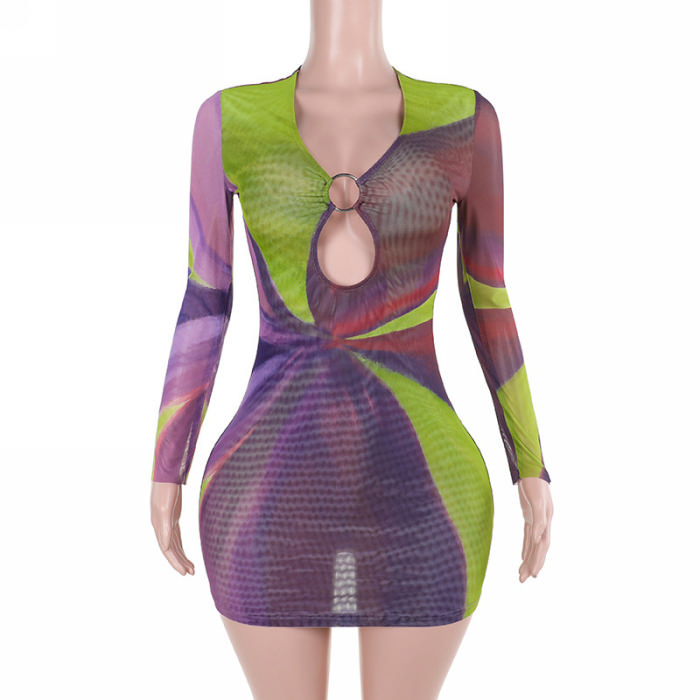 (Real Image)2024 Styles Women Color-Block Printed Hollow-Out Ring-Detail Long-Sleeve DressSKU: #XF92939-1