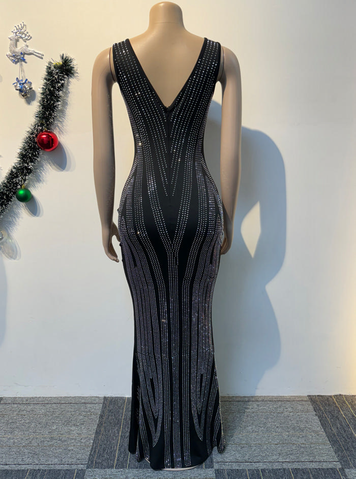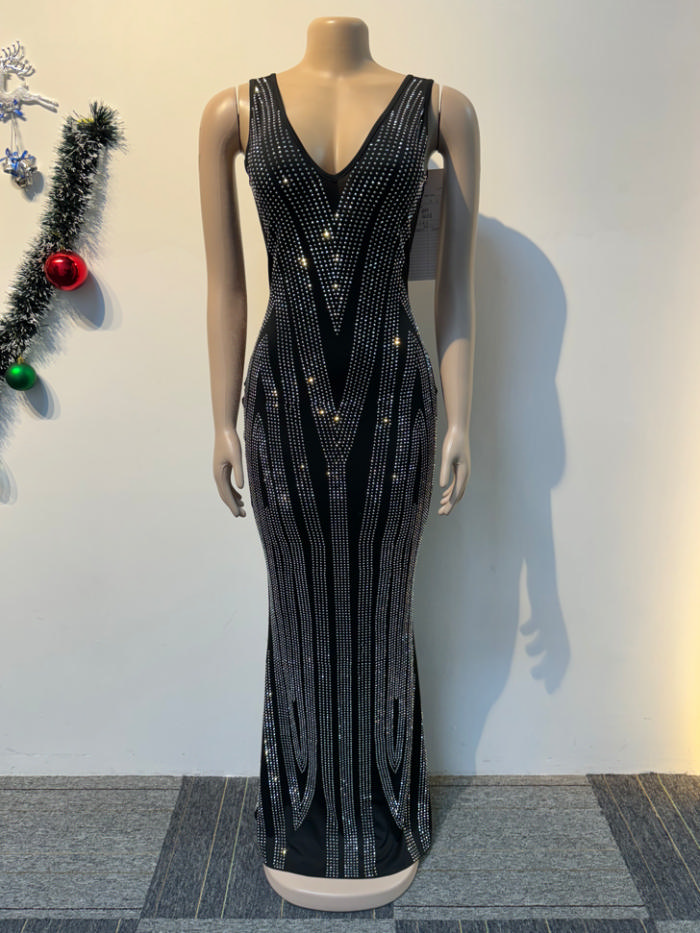 (Real Image)2024 Styles Women Double-Sided Rhinestone V-Neck Sleeveless Stretchy Bodycon Maxi DressSKU: #XF27478-1