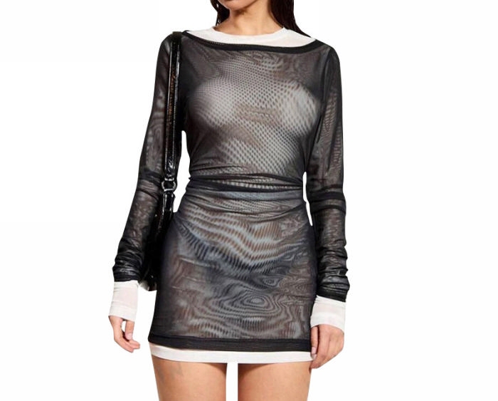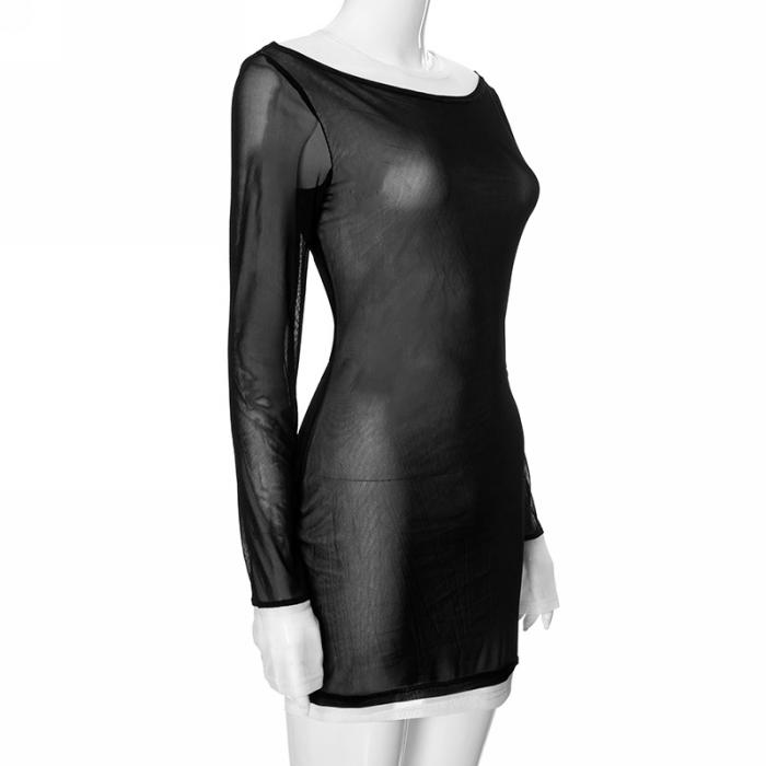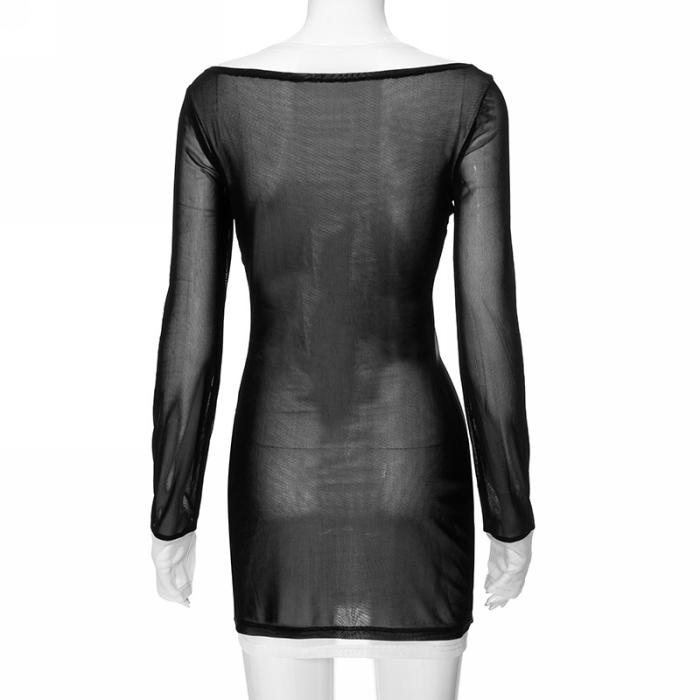 (Real Image)2024 Styles Women Fashion Black and White Color-Blocked Mesh Round Neck Pullover Long Sleeve Sheer Sexy Mini DressSKU: #CF76168-1