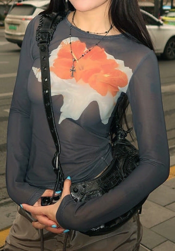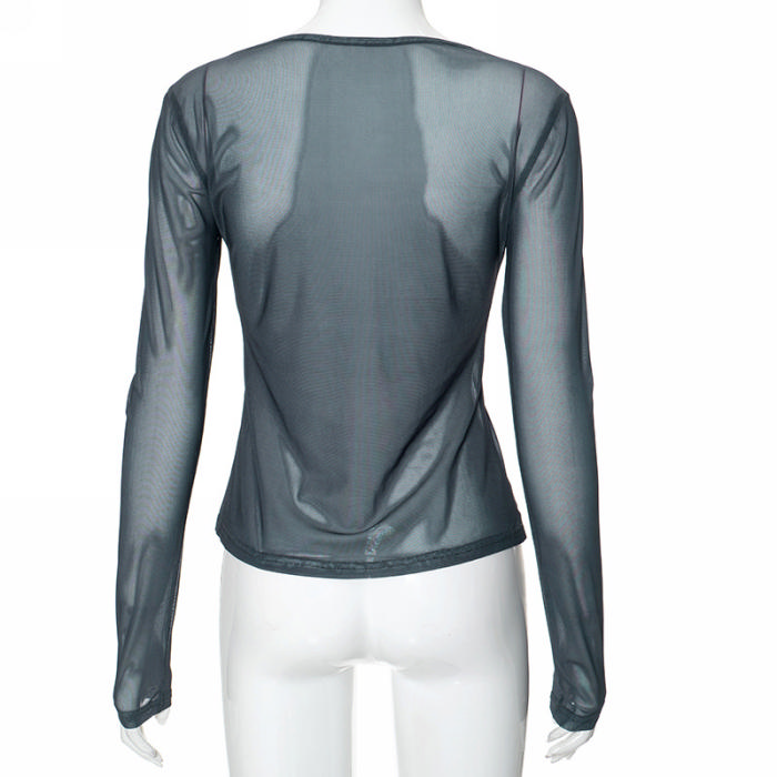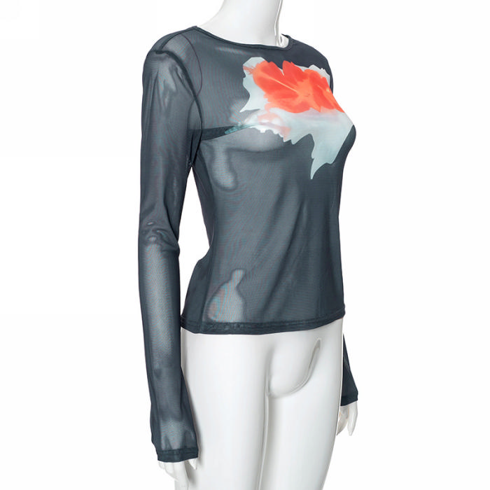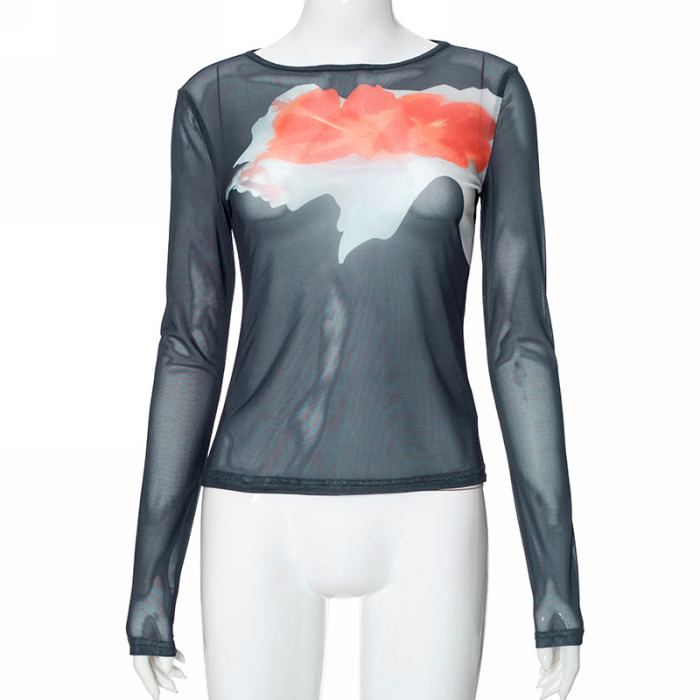(Real Image)2024 Styles Women Fashion Mesh Print Round Neck Pullover Long Sleeve TopSKU: #CF76160-1